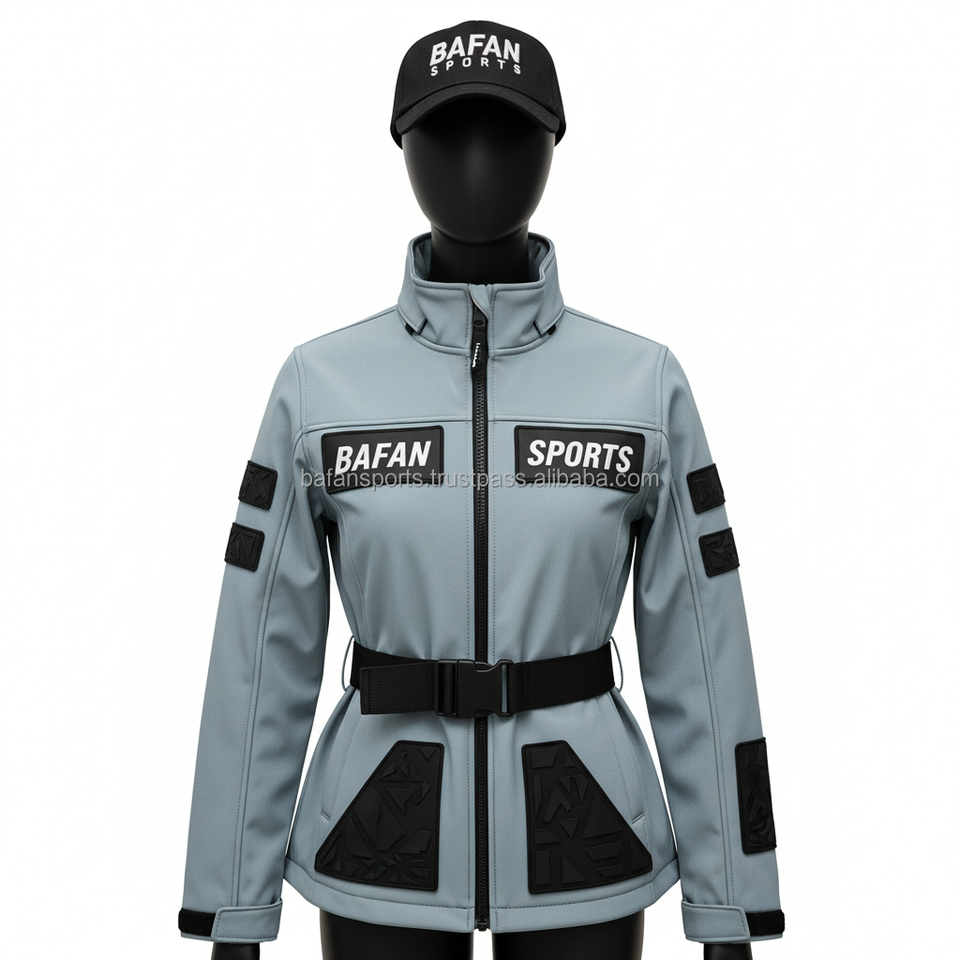 Veste Softshell pour femmes Tissu 320GSM Gris avec panneaux noirs Logo personnalisé Conception par transfert thermique Veste Softshell pour femmes