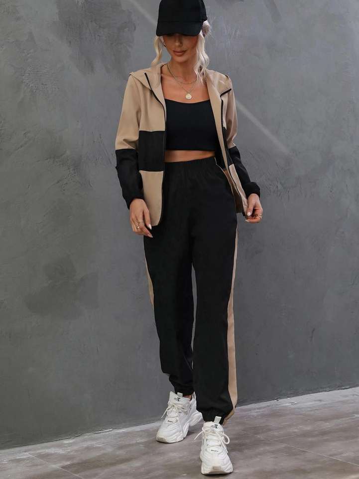 Ensemble de survêtement pour femmes avec panneaux contrastés, veste à capuche et pantalon taille haute, tenue décontractée sportive écologique en deux pièces