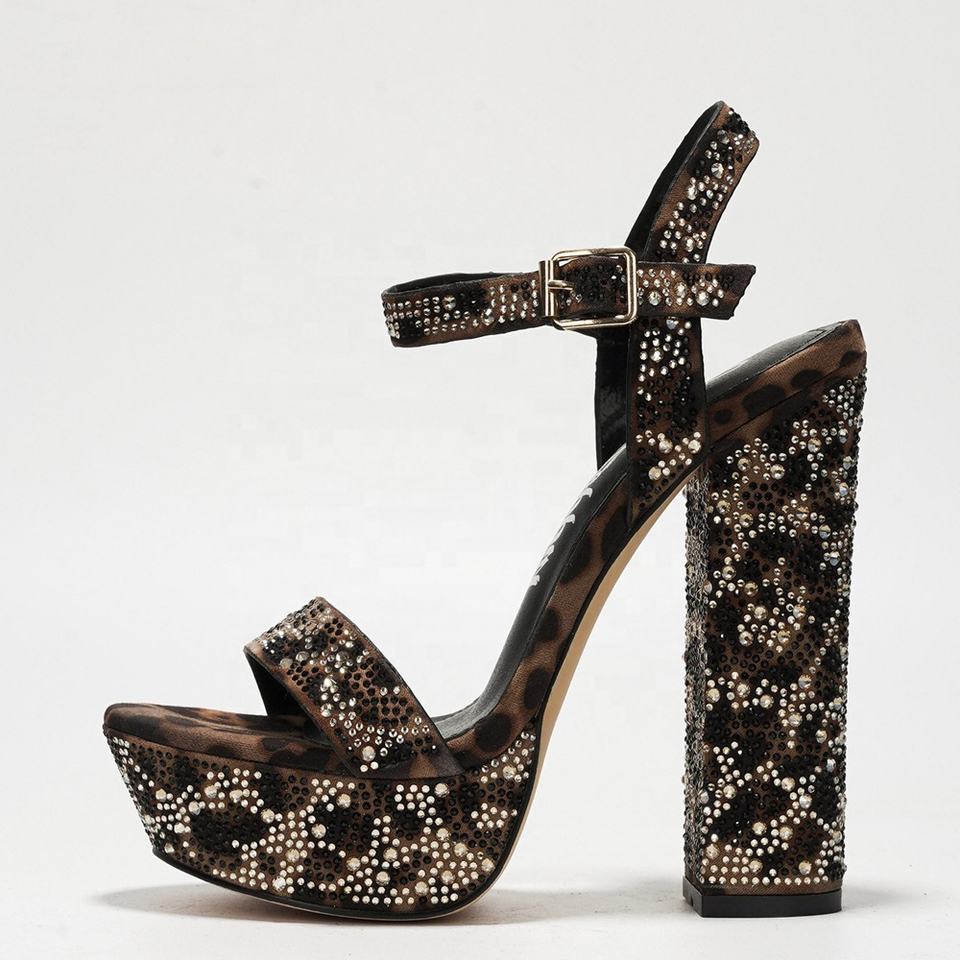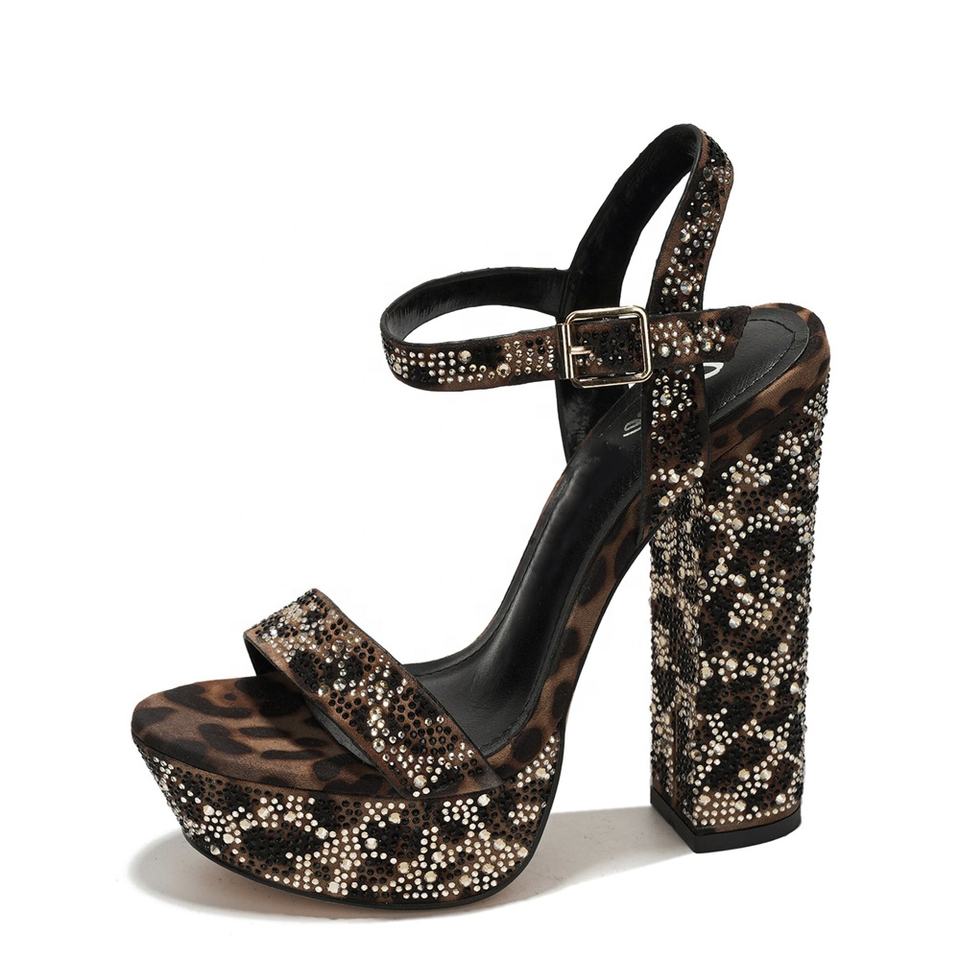 Sandales à bout carré pour femmes, ornées de strass, talons épais, plateforme large, imprimé léopard, chaussures de soirée