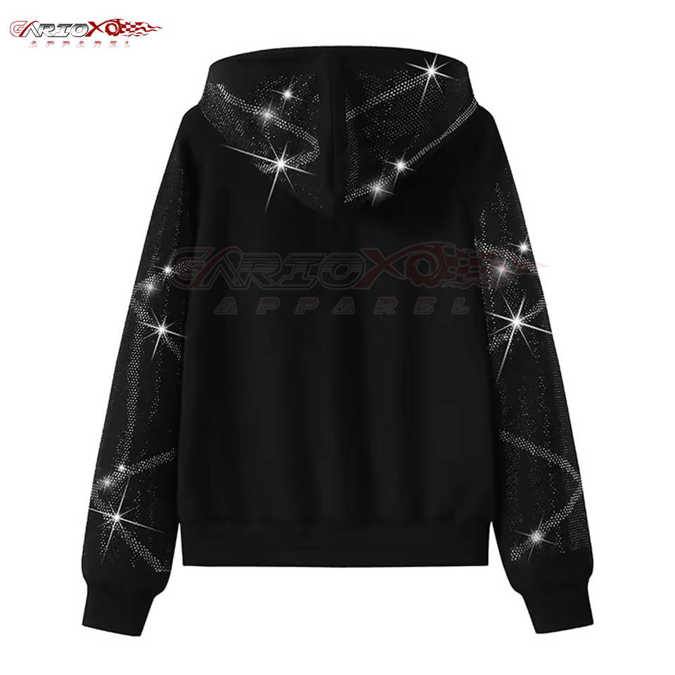 Survêtement deux pièces pour femmes avec strass étincelants et finition propre pour les voyages ou les clubwear, sweat à capuche zippé pour femmes