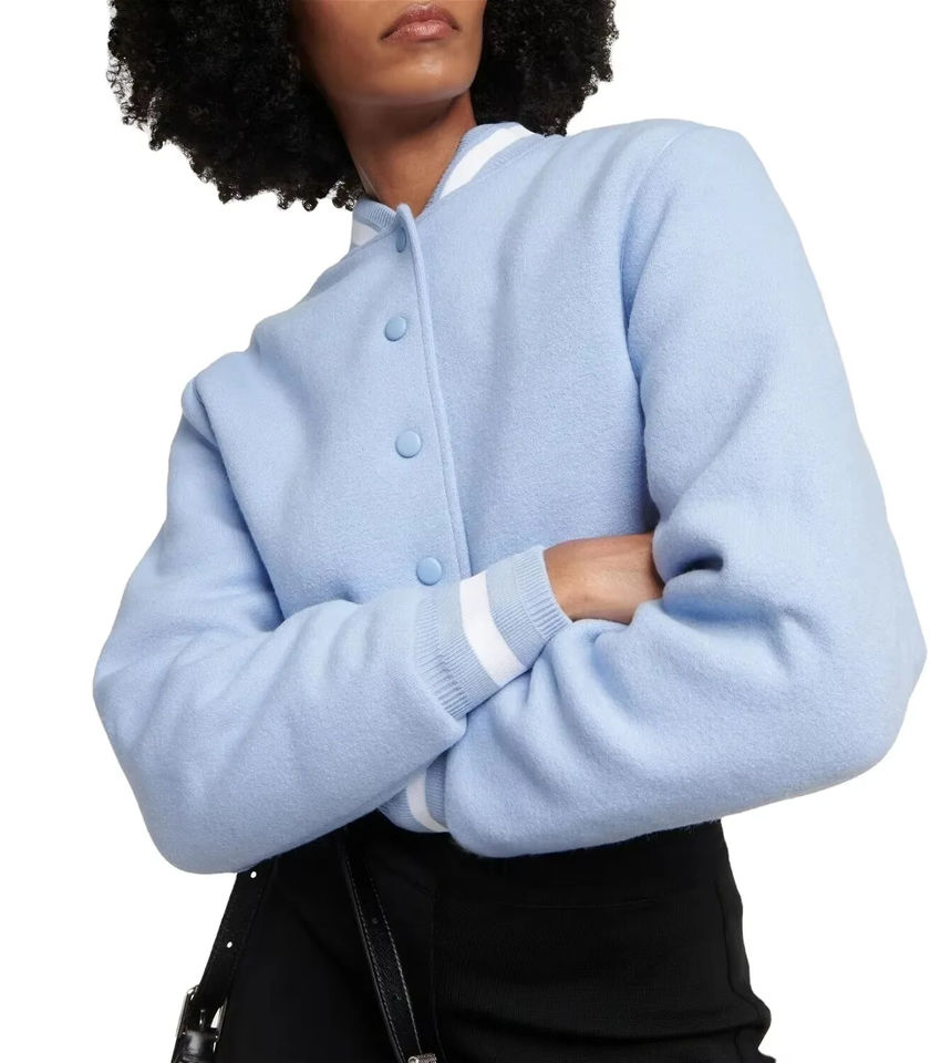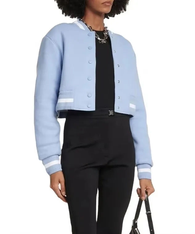 Blouson Bomber Court Femme Style Universitaire avec Manches en Laine, Broderie Personnalisée OEM, Lettrage Baseball, Tricoté, Vente en Gros Usine