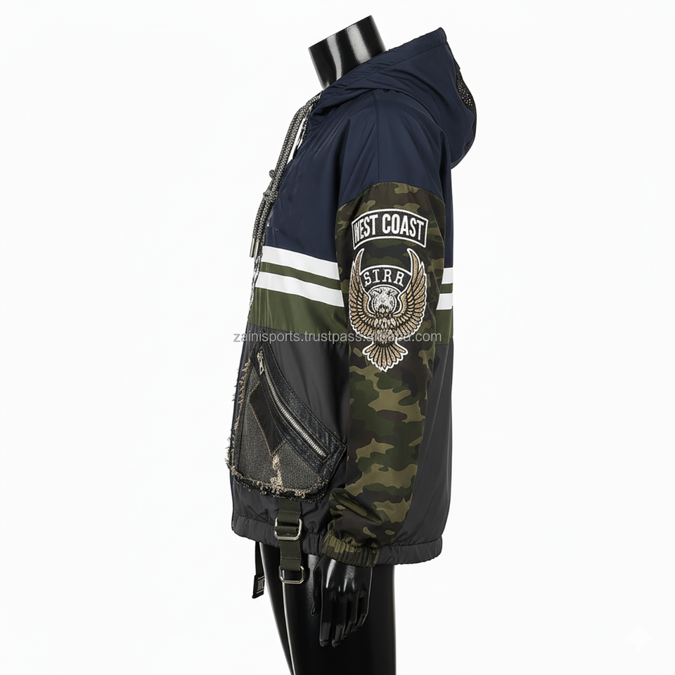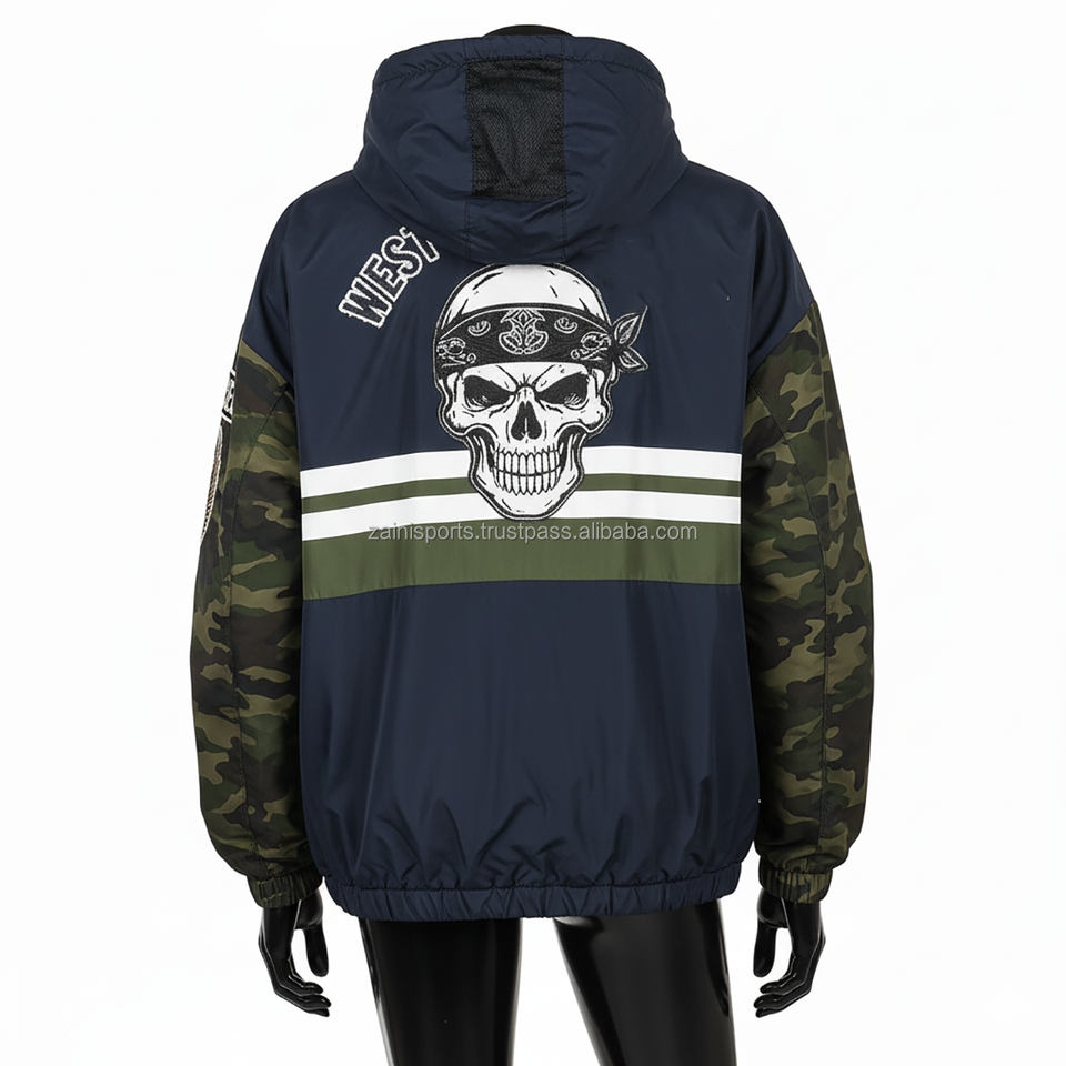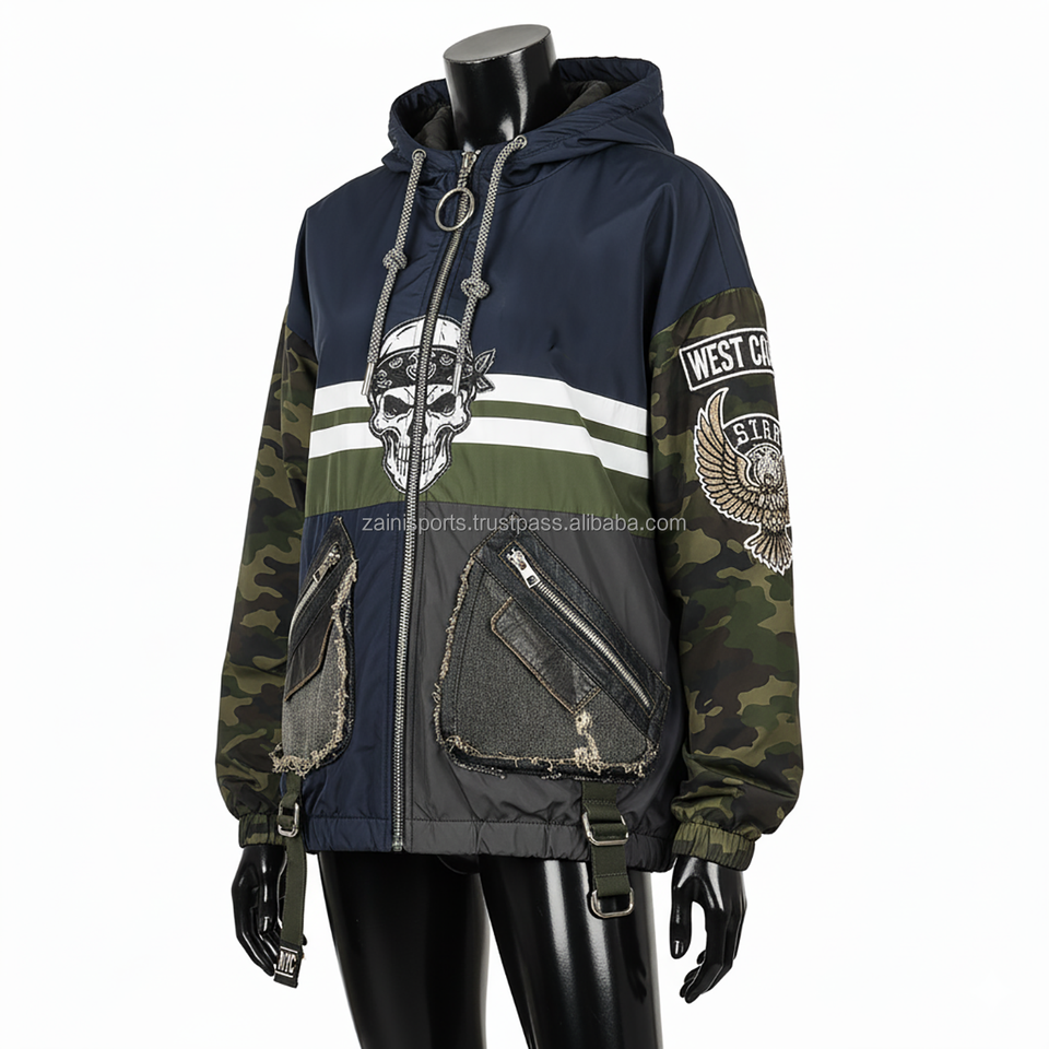 Coupe-vent en nylon pour femmes 220GSM Shell avec manches camouflage Denim poches plaquées imprimé tête de mort broderie Logo personnalisé Veste pour femmes