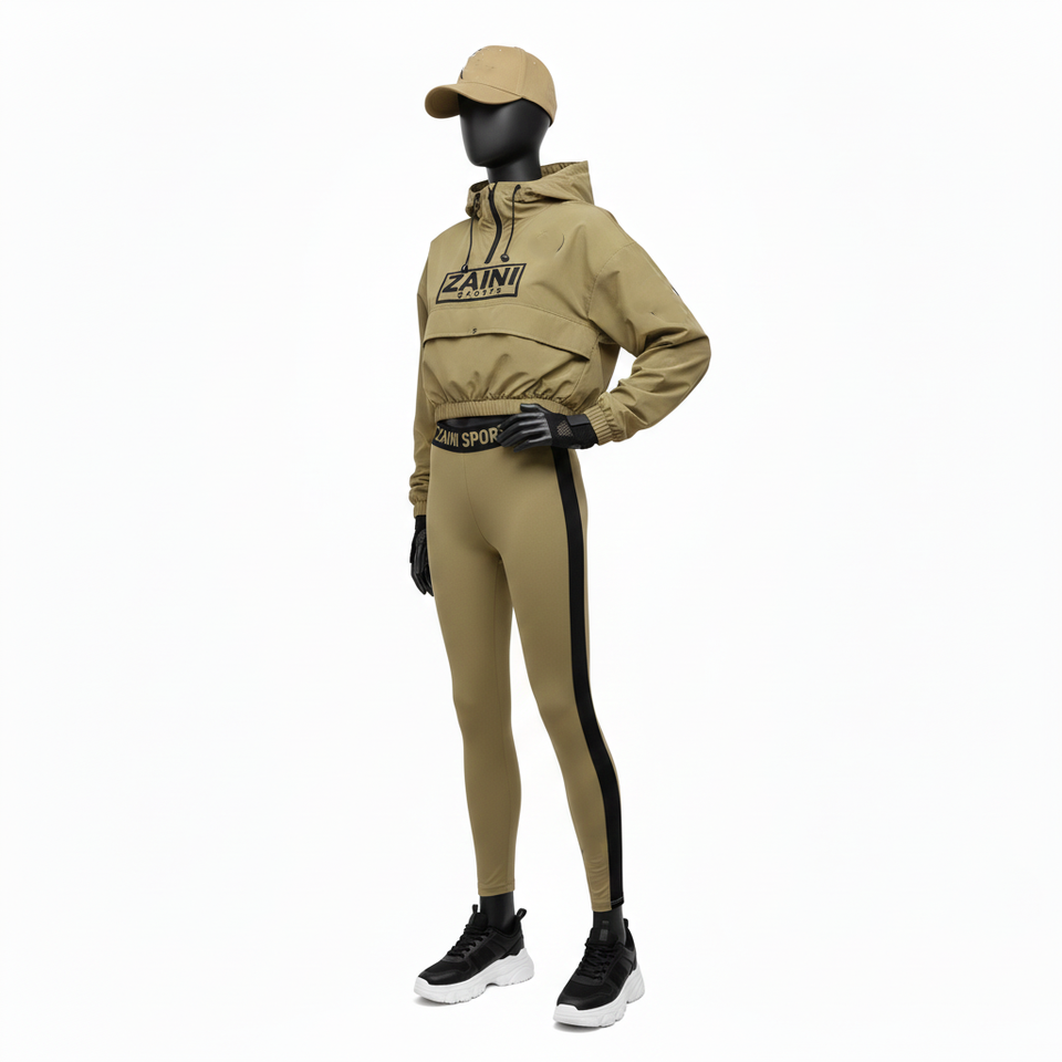Ensemble coupe-vent pour femmes, tissu tissé en polyester et nylon de qualité supérieure, design à panneaux kaki et noir, logo par transfert thermique, ensemble coupe-vent grande taille