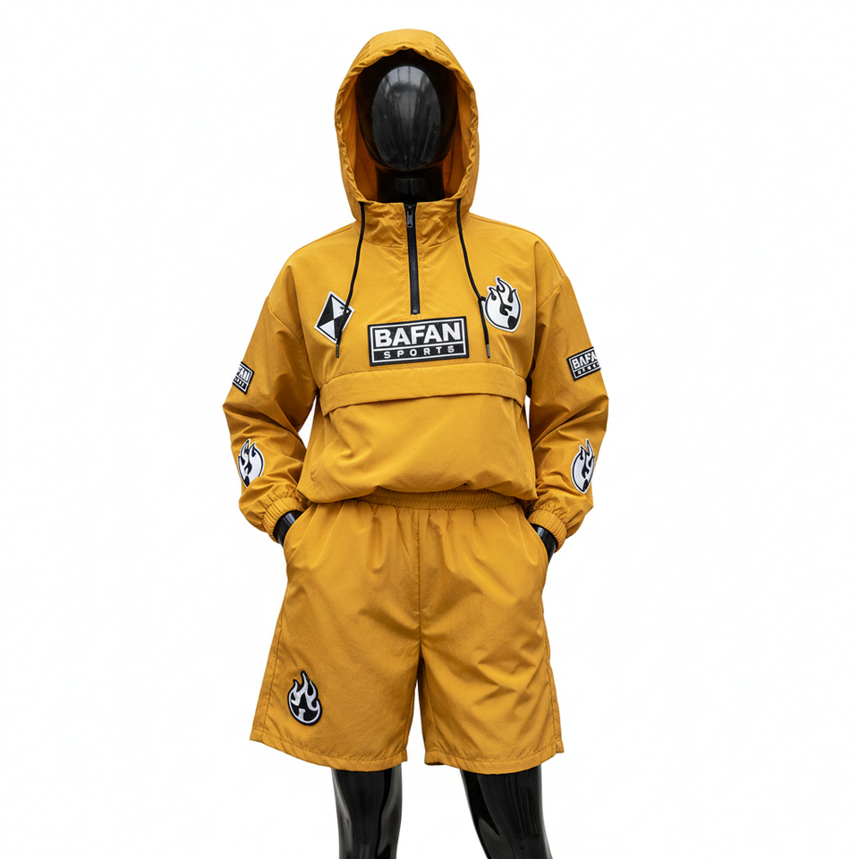 Ensemble short coupe-vent pour femme en polyester, tissu coupe-vent, design à empiècements à capuche, logo personnalisé, ensemble short coupe-vent pour femme grande taille