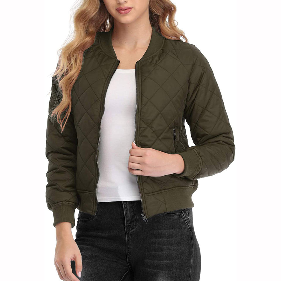 Women quilted bomber jacket lightweight zip up short outerwear casual green puffer coat with ribbed cuffs
