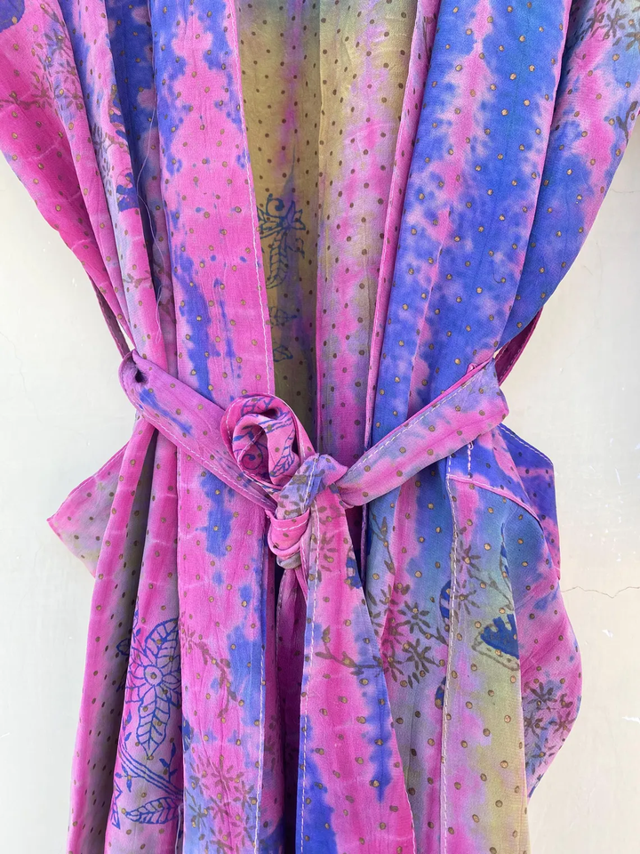 Women's 100% Silk Tie Dye Kimono Robe Quick Dry Soft Free Size for Summer Autumn Spring-Daily Life Style with Drawstring Closure