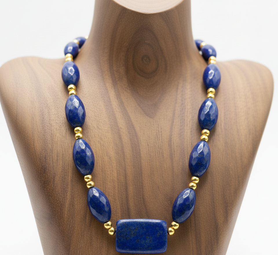 Women's 18-Inch Silver 925 Gold Plated Hand Knotted Geometric Trendy Fashion Accessory Natural Lapis Lazuli Stone Beaded Gift