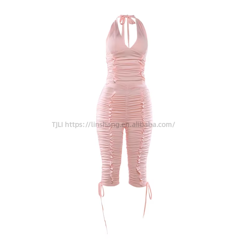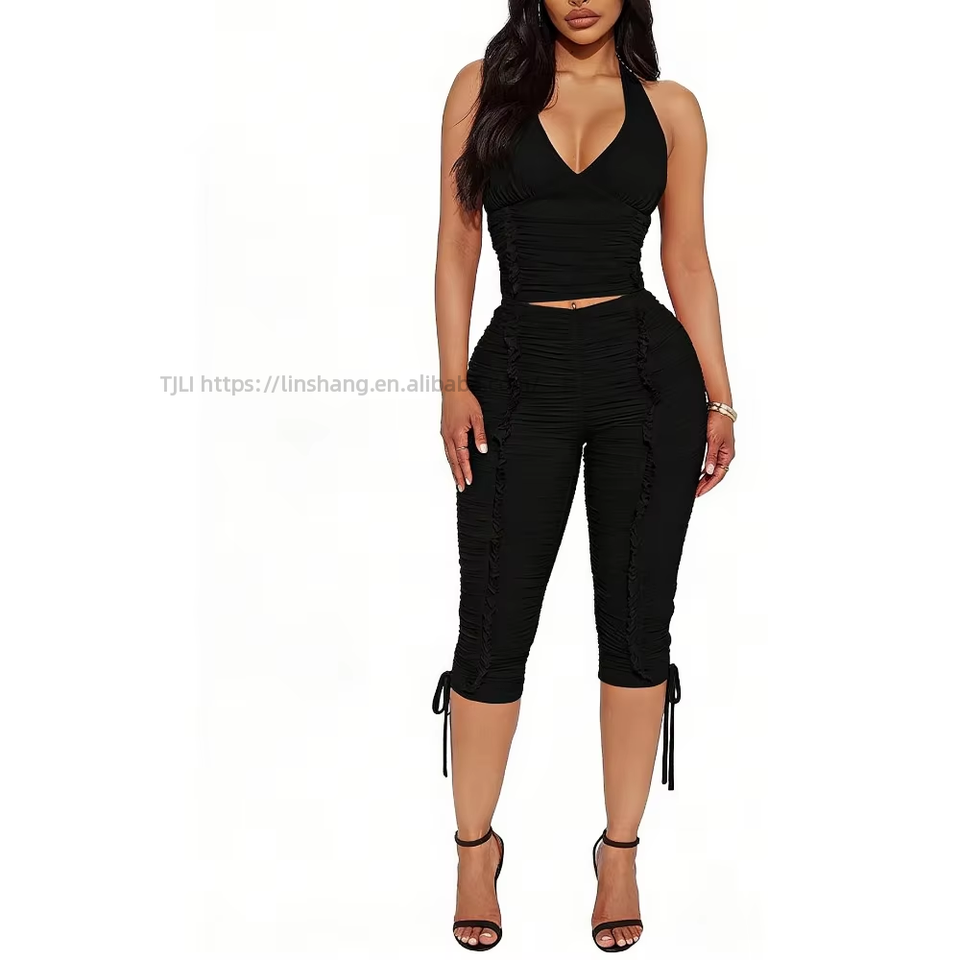 Ensemble 2 pièces froncé pour femme : Crop top licou et pantalon capri froncé pour soirées et boîtes de nuit – Tendance