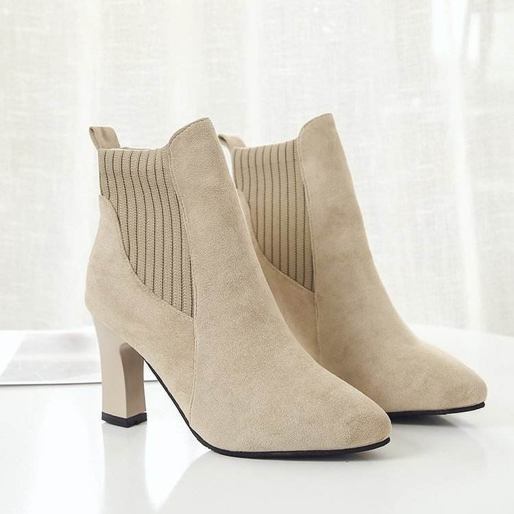 Women's 2021 Winter Mid Heel Suede Naked for Martin Boots Pointed Ankle Slip-On Closure Fleece-Lined High Heel Small Heel Boot