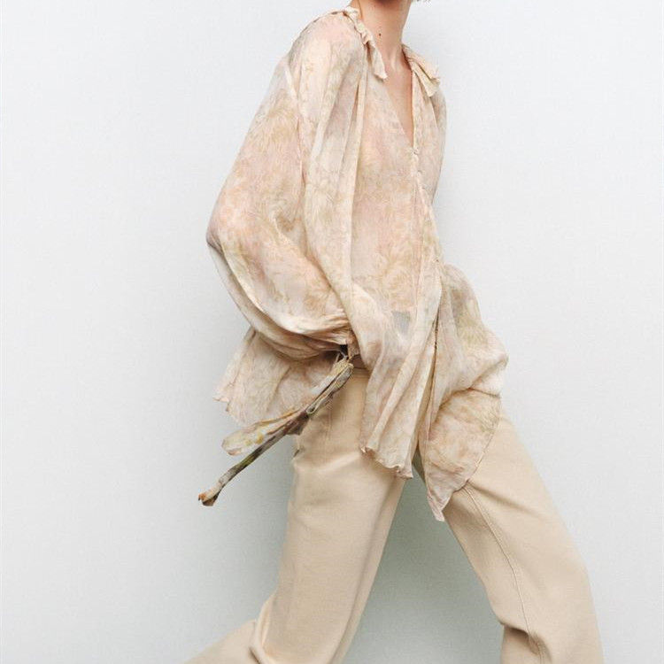 Chemise à manches longues asymétrique à col en V imprimée pour femmes 2025 printemps nouvelle couche décorative