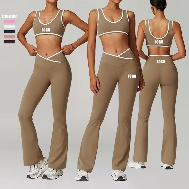 Ensemble de sport 4 pièces pour femme - Haut court à manches longues, pantalon de jogging taille haute, soutien-gorge de sport, débardeur de yoga, tenue de gym et de détente