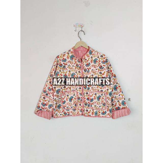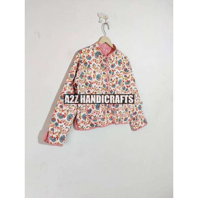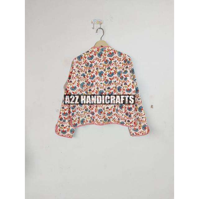 Women's Amazing Quilted Winter Coat Silk Lining Cotton Handblock Printed Stripe Piping Button Decoration Short Fashion Jacket