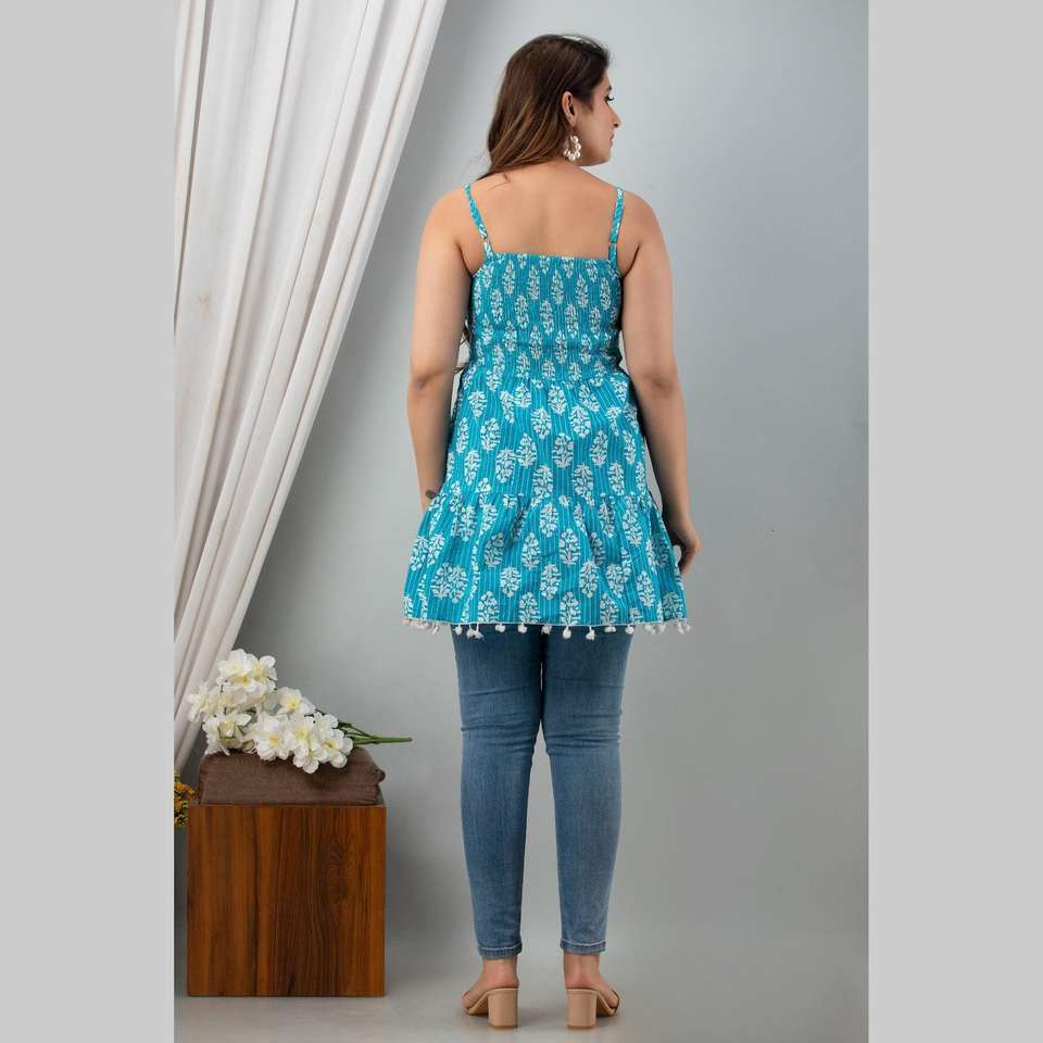 Women's Aqua Blue Cotton Printed Smocked Sleeveless Top