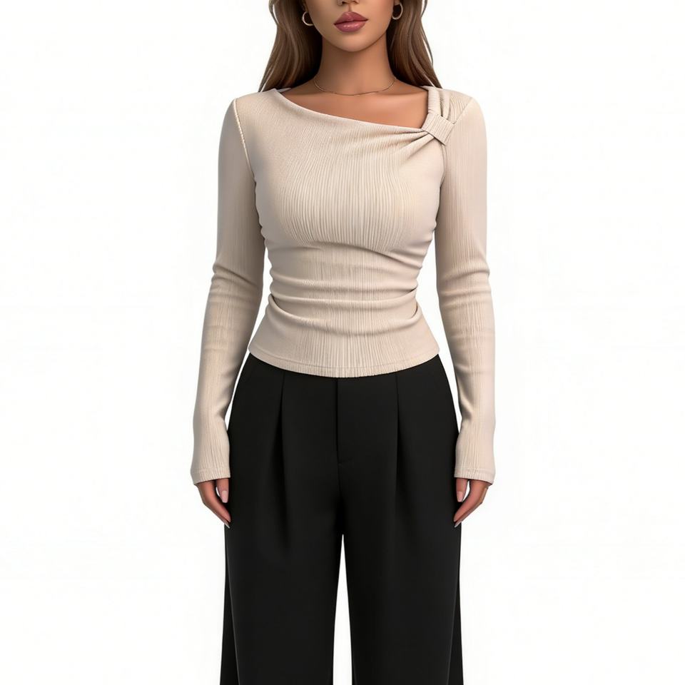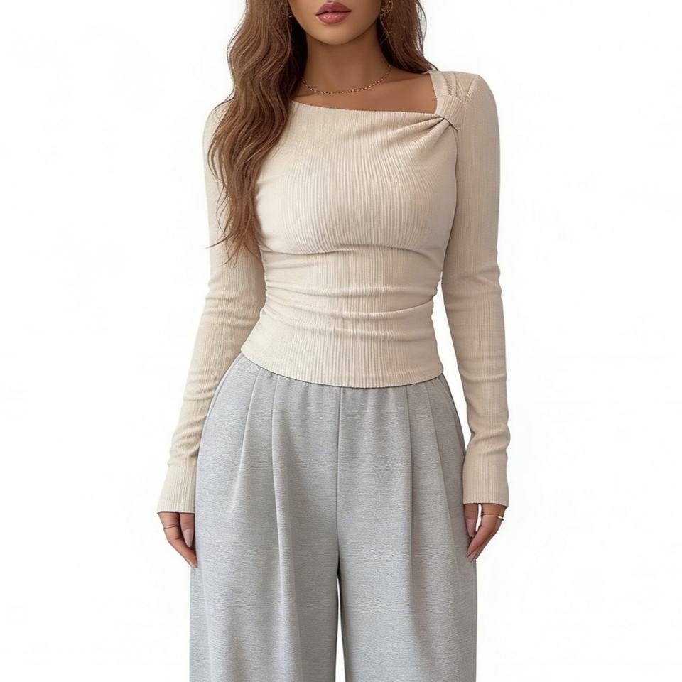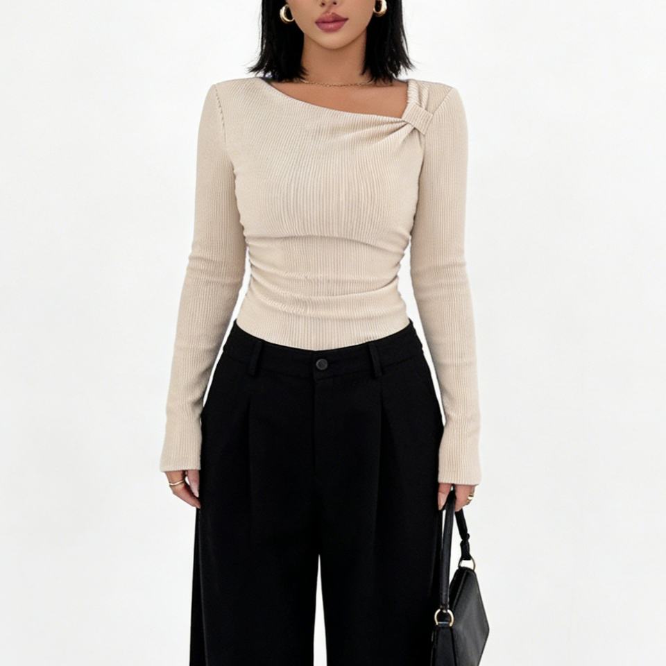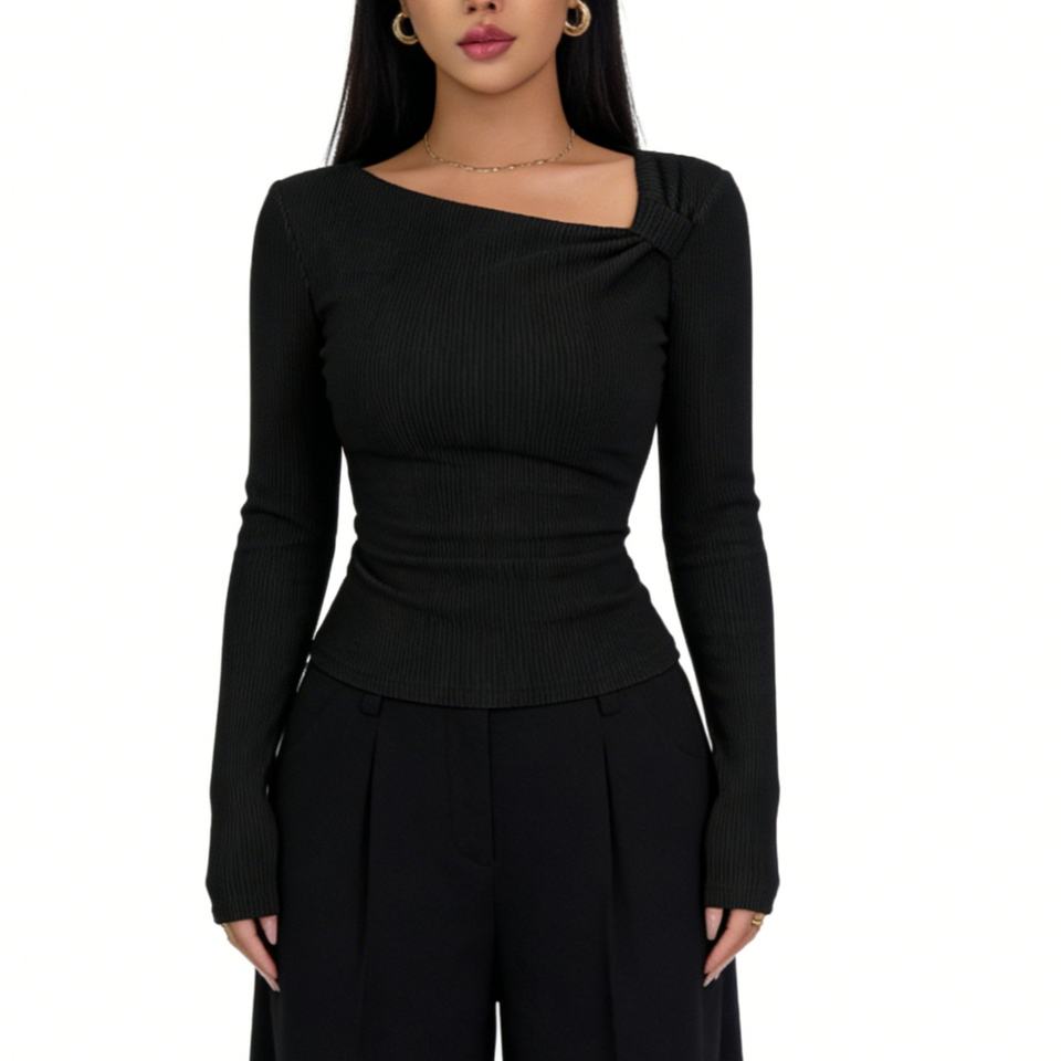Haut côtelé asymétrique froncé à col asymétrique pour femme - T-shirt court ajusté à manches longues tendance