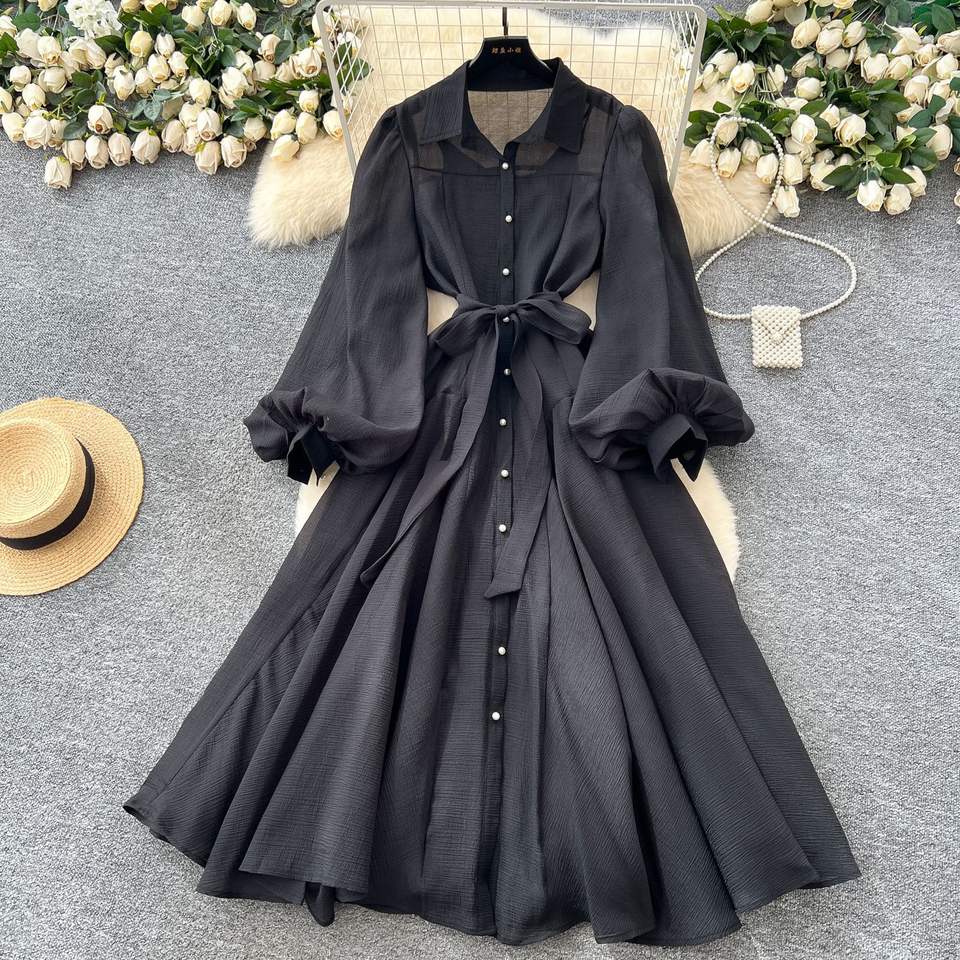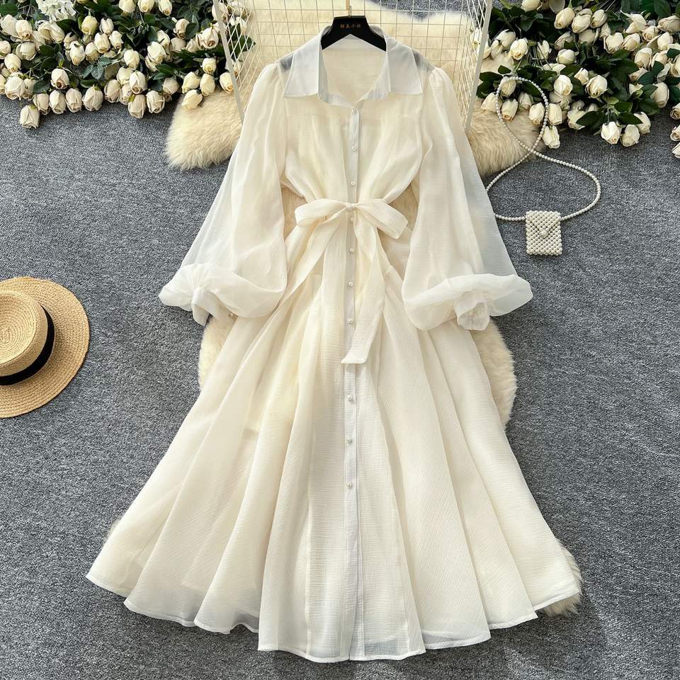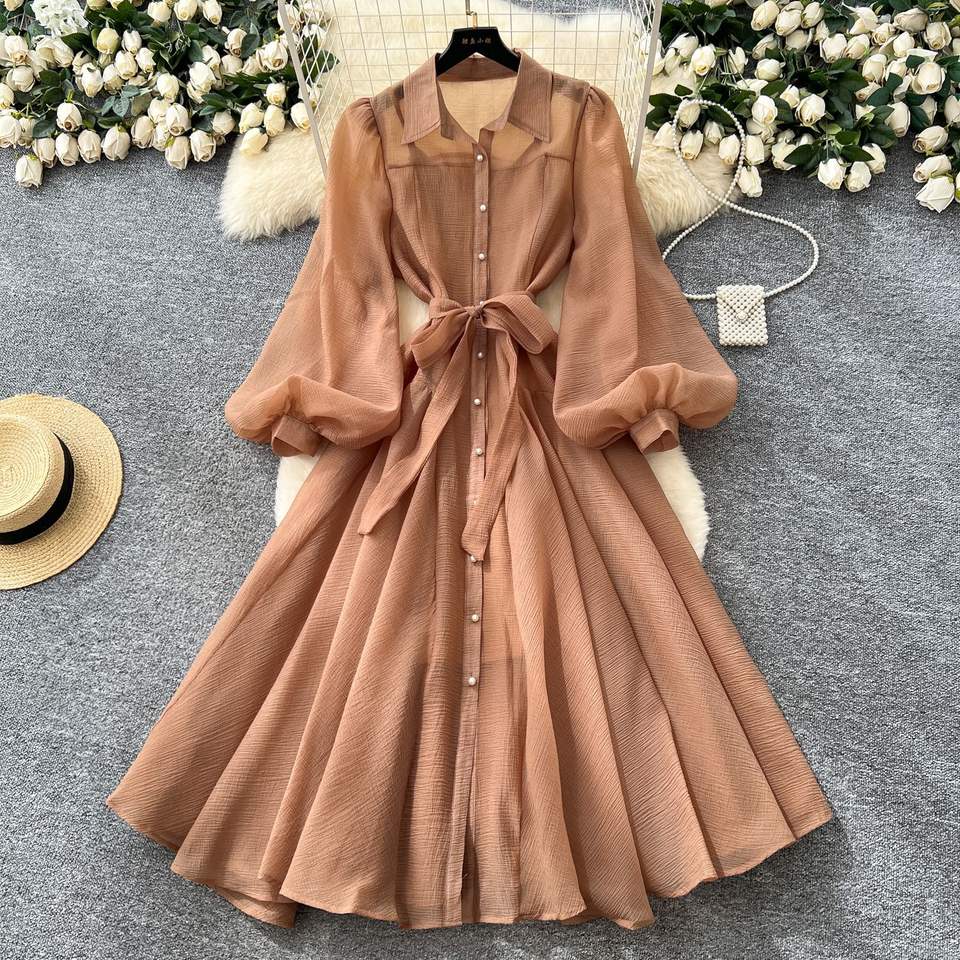 Women's Autumn Collared Single-Button Tie-Waist Bell-Sleeve Dresses Fashion