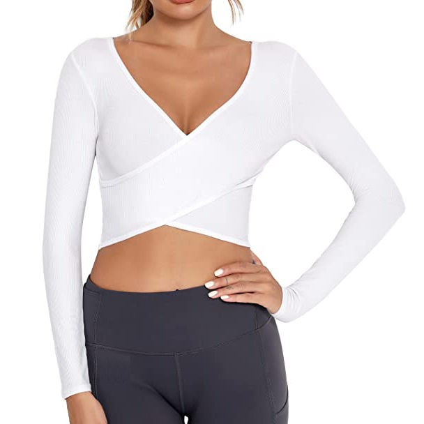 T-shirt court basique à manches longues et col en V pour femmes haut pull solide col en V à manches longues T-shirt torsadé sur le devant coupe ajustée haut basique
