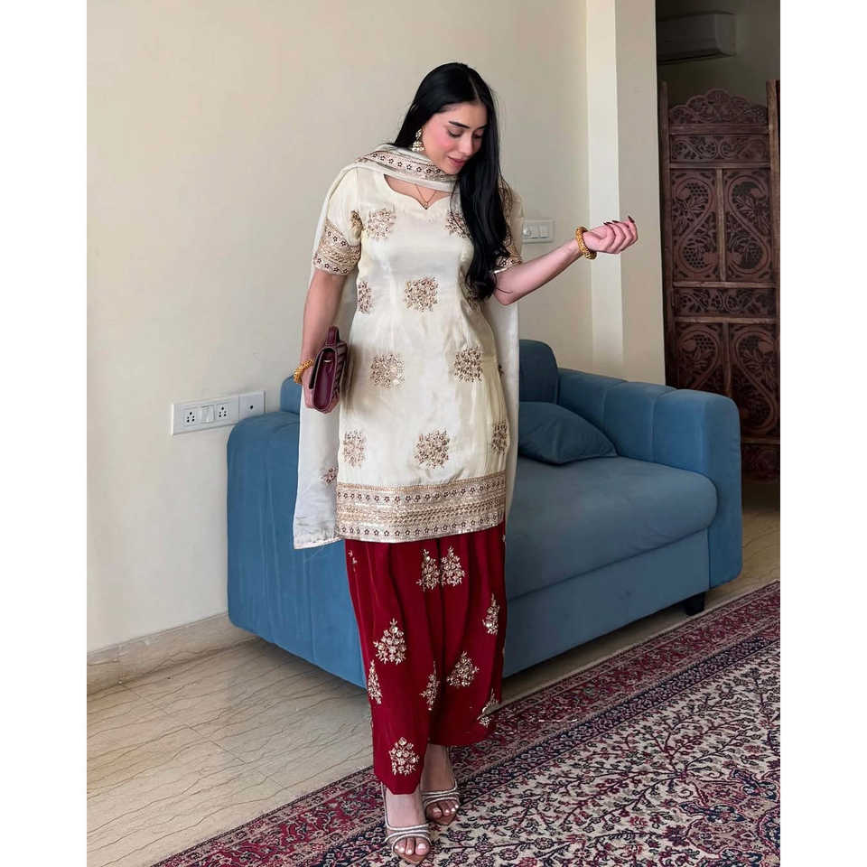 Belle combinaison de travail brodée à séquences pour femmes avec Plazzo et Dupatta
