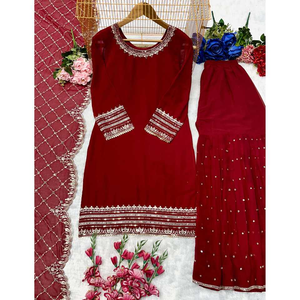 Women's Beautiful Party Wear Top Sharara Dupatta Set with Embroidery Work