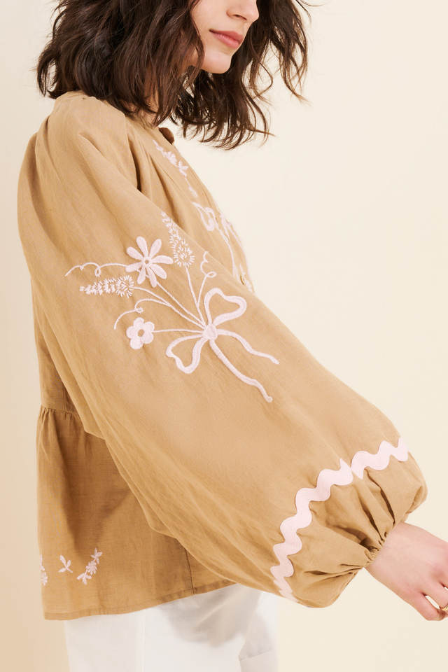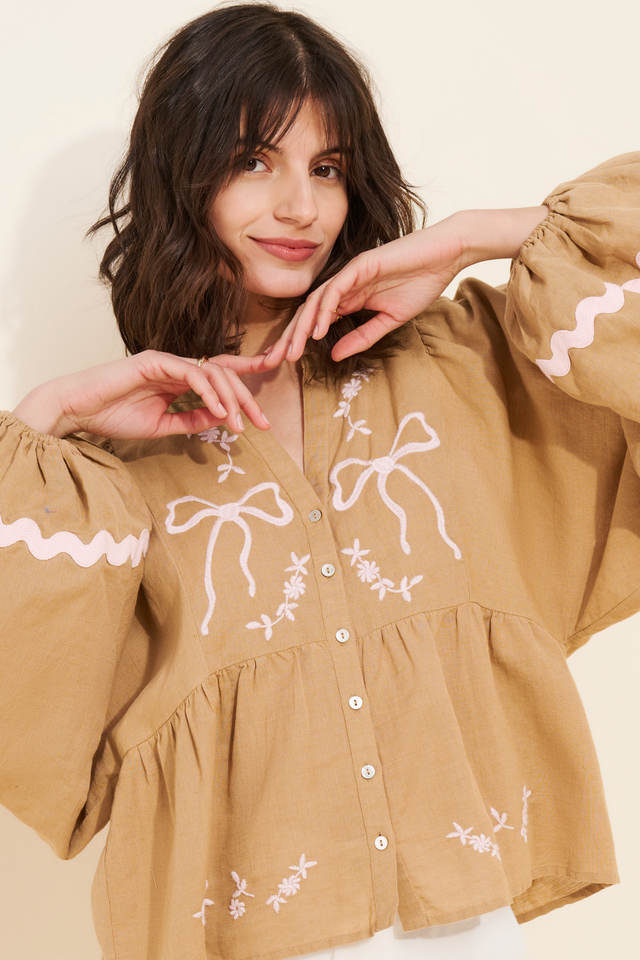 Chemisier beige à boutons brodés pour femme avec manches flottantes et détails floraux avec un nœud Design Vintage ODM