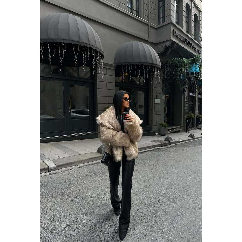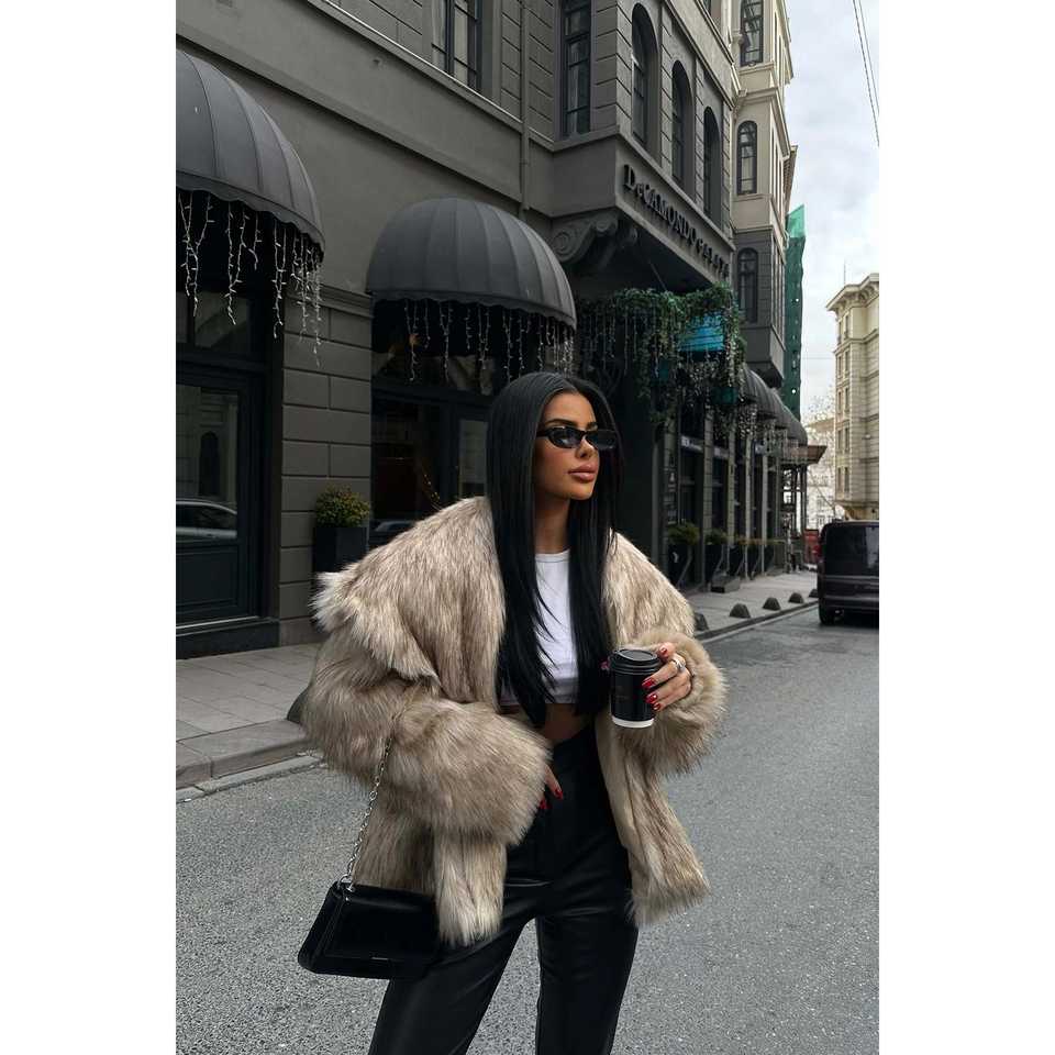 Manteaux en fausse fourrure beige pour femmes avec col en forme de mouchoir