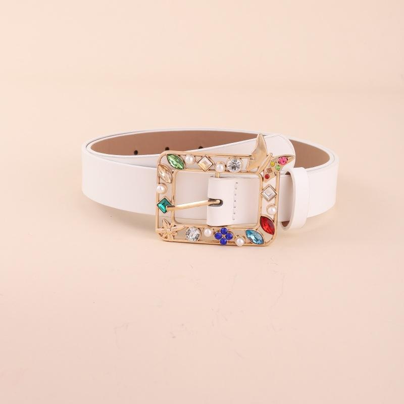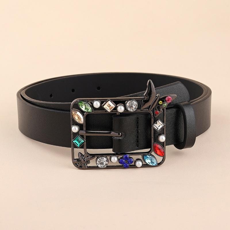 Ceinture PU en cuir de vachette Simple élégante pour femmes longueur réglable coloré strass incrusté boucle en alliage élégant Simple ceinture en PU