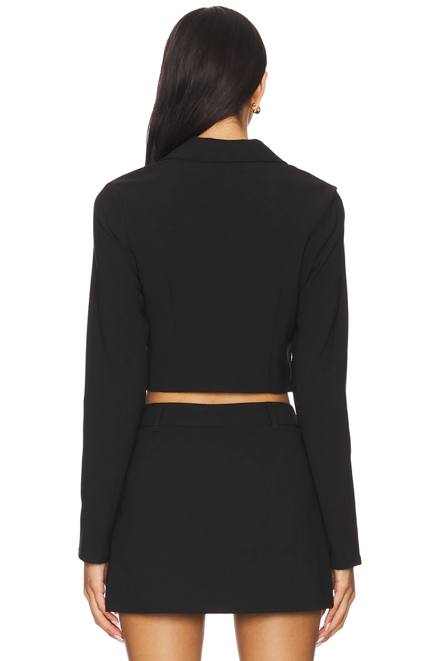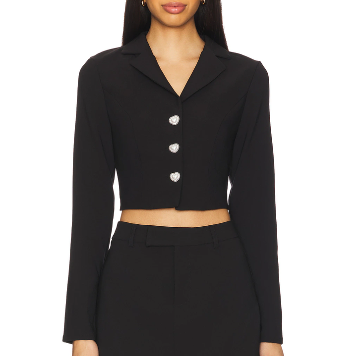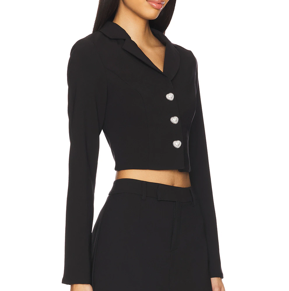 Manteau de costume professionnel noir pour femme, coupe courte, avec boutons en forme de cœur ornés de strass et de perles, col à revers cranté, manches longues, tendance