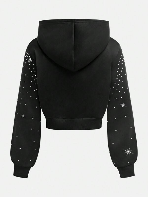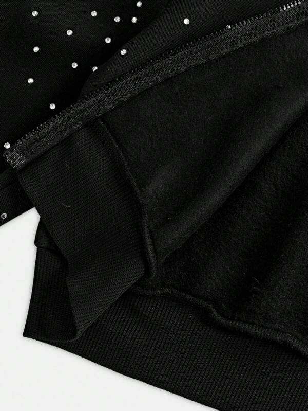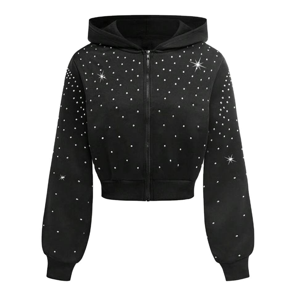 Sweat à capuche zippé pour femme, noir, orné de strass et de sequins, 100% coton, 420GSM, lourd, streetwear personnalisé, coupe courte, mode d'hiver, devant