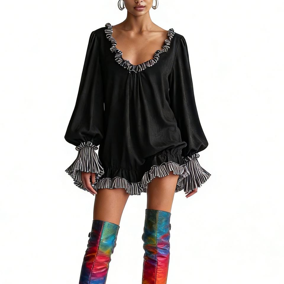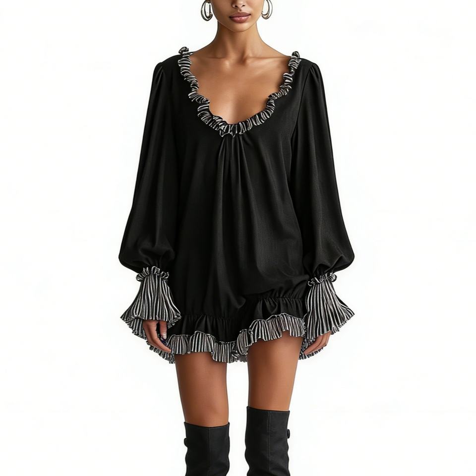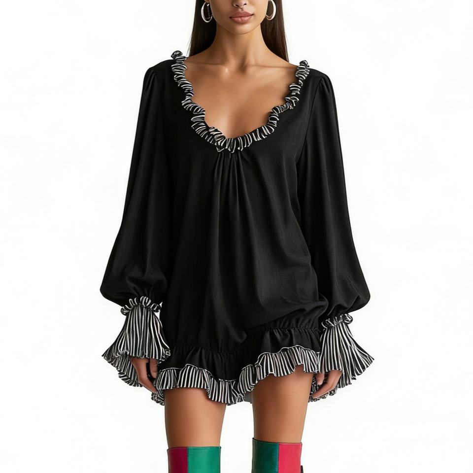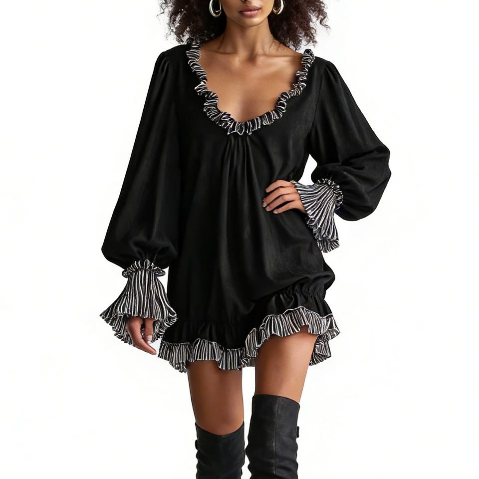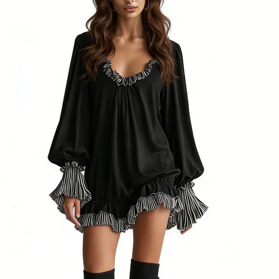 Robe Courte Noire à Volants pour Femme - Décolleté en V, Manches Longues, Coupe Ample, Décontractée, avec Bordure Rayée - Robes Tendance pour Femme