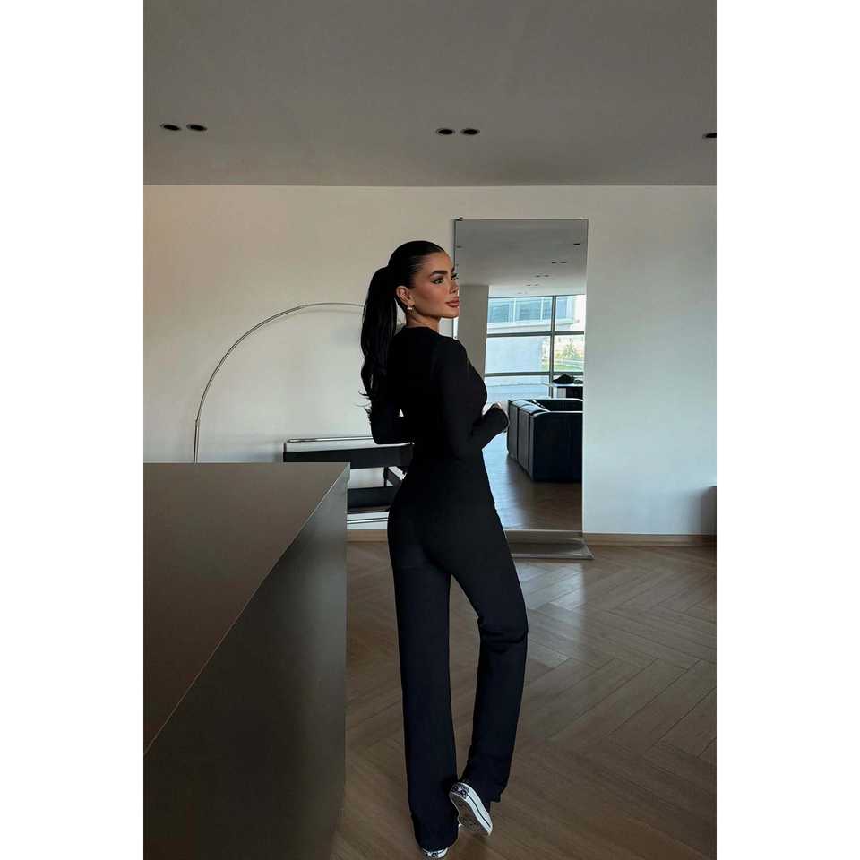 TRAFZA Ensemble de body et de pantalons longs élégants de style club pour femmes Taille XS Col haut à manches longues en dentelle Top creux Sexy Taille élastique