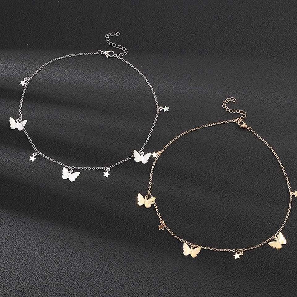 Women's Boho Silver Fine Pendant Necklace Butterfly and Star Choker with Dangle Chains Jewelry
