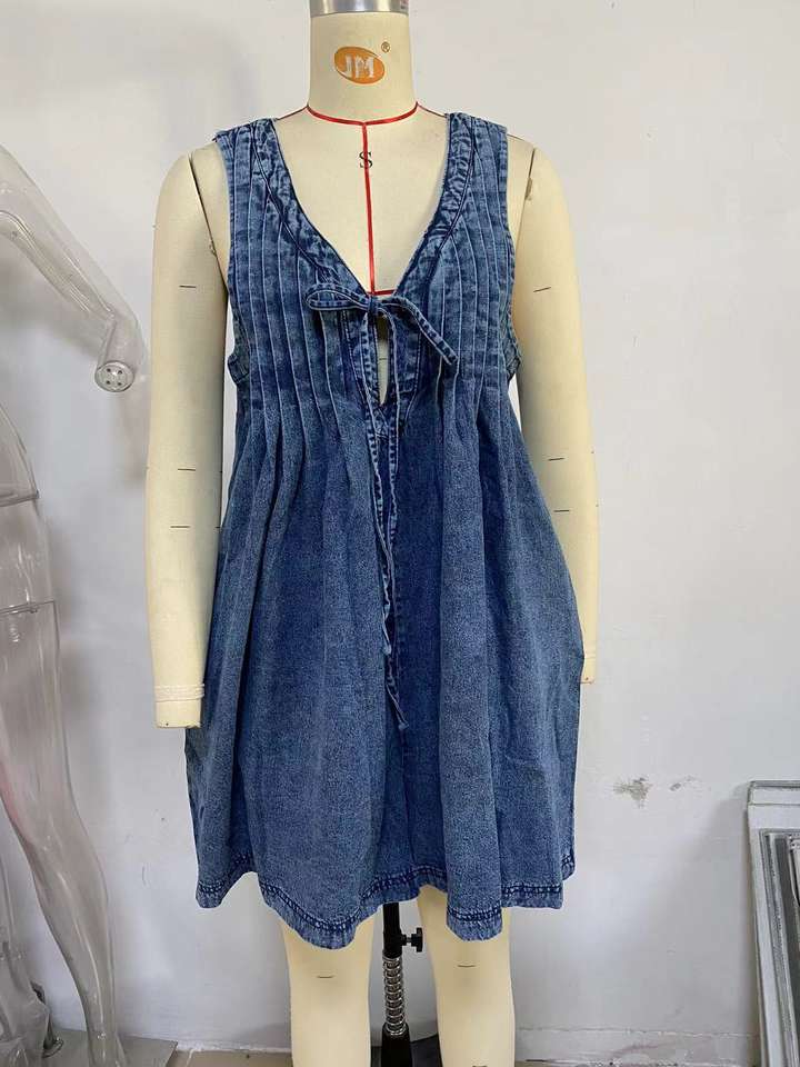 Femmes respirant col en V profond à lacets maigre Denim combinaison barboteuses plissé sans manches une pièce pantalon côté Denim combinaison