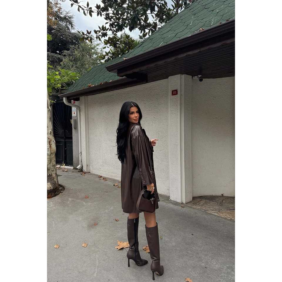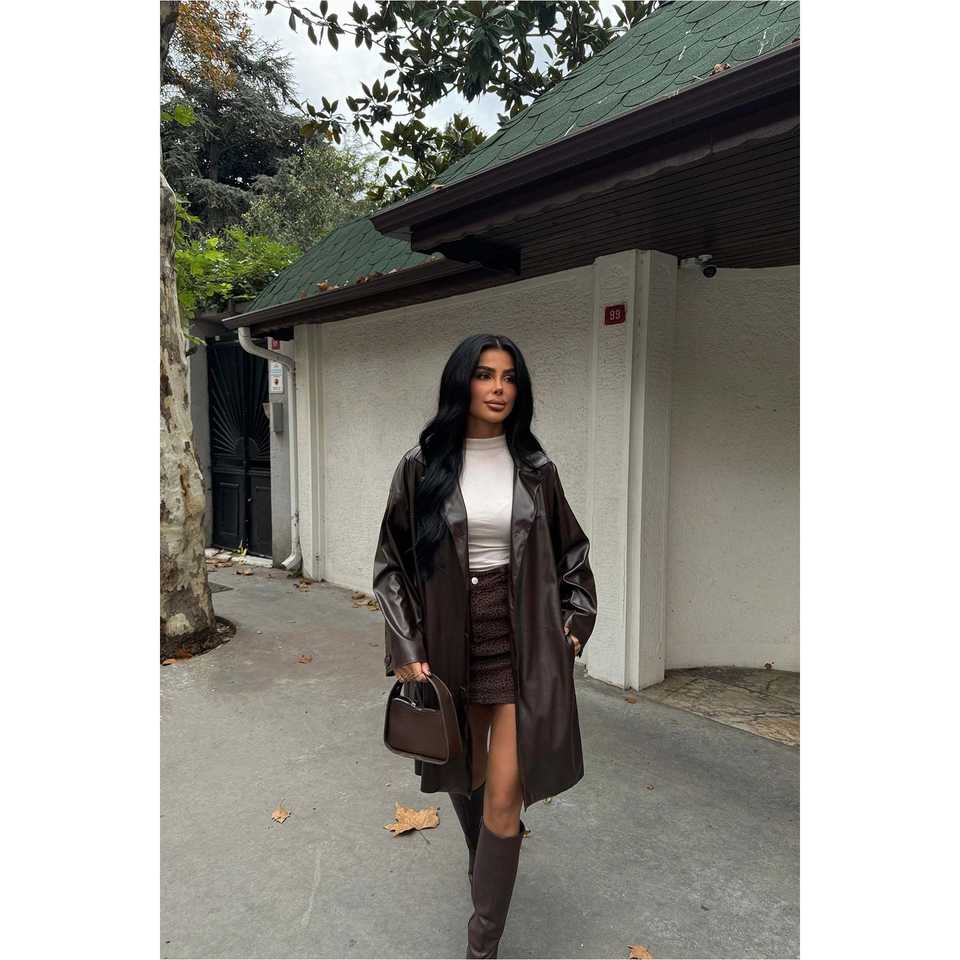 Women's Brown Shearling Leather Trench Coat Faux Fur Lining Cotton Fill Waterproof Print Decoration Casual for Autumn Winter