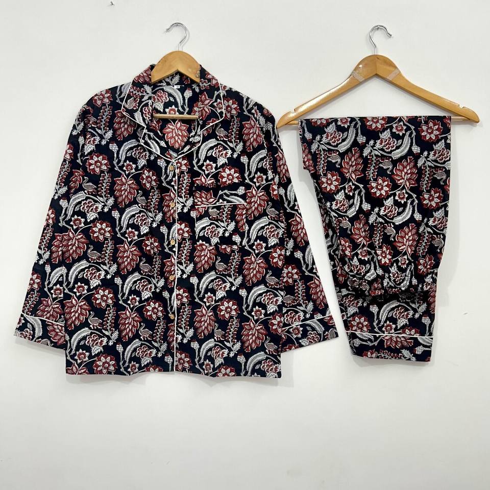 Ensemble pyjama boutonné en coton pour femme coton indien printemps/été motif floral/caractère/lettre/motif/vacances/motif cocotier