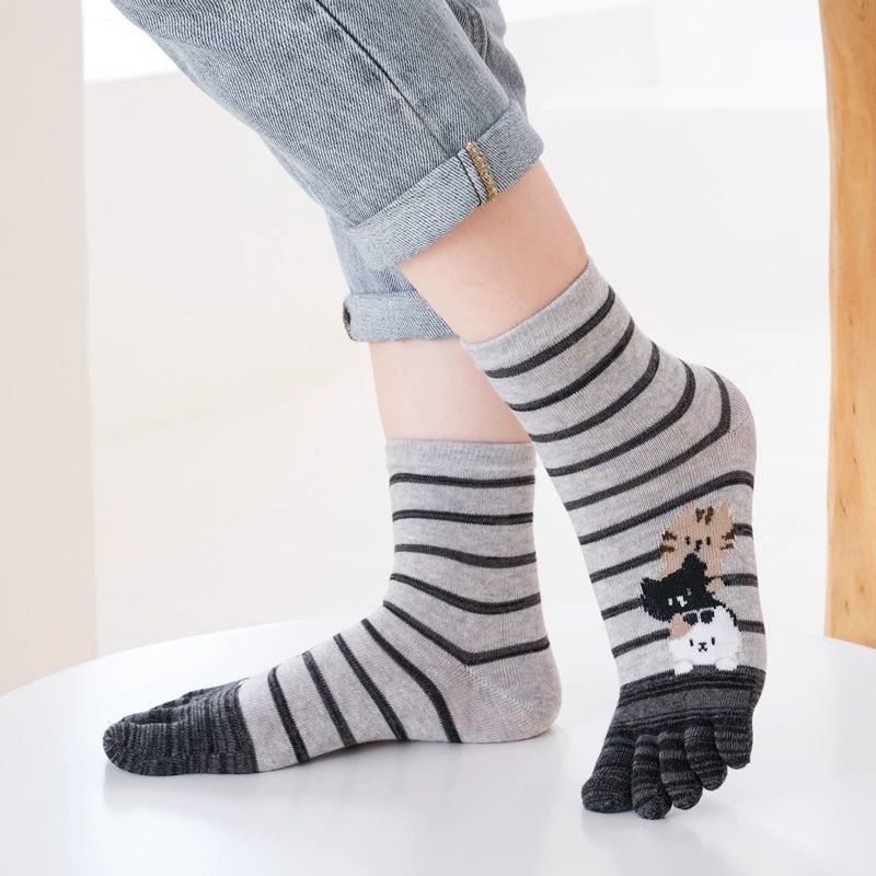 Chaussettes mi-mollet à cinq doigts pour femmes, motif rayé de chat de dessin animé