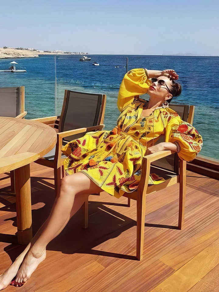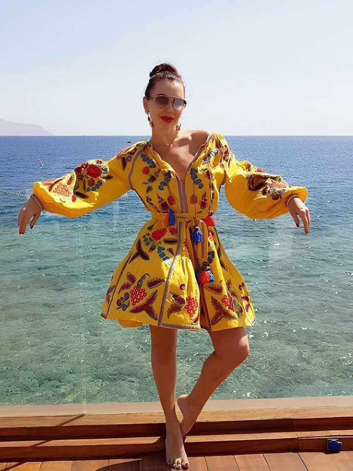 Women's Casual Bohemian Style Mini Dress Vacation Fashion V-Neck Button Waist Belt Eco-Friendly Washable Embroidery Tassel Waist