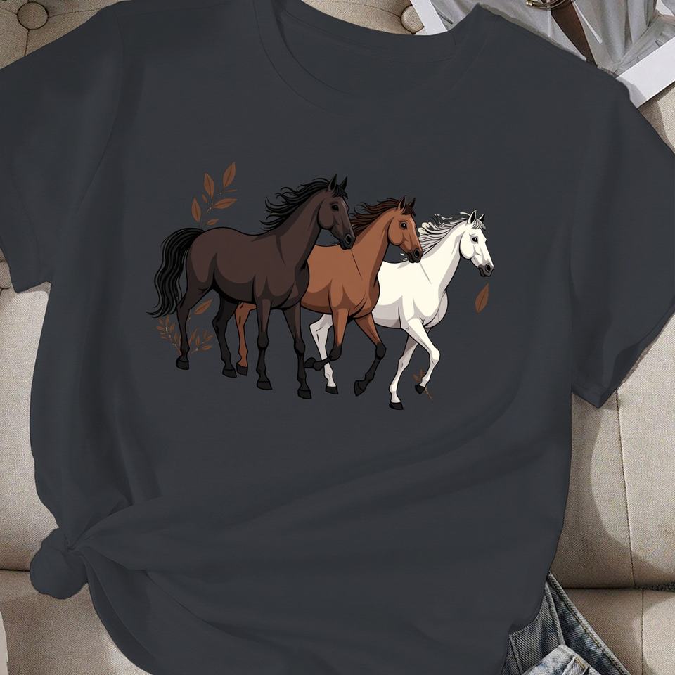 Women's Casual Equestrian Three Horses Print Polyester Knitted Crew Neck Short Sleeve T-Shirt