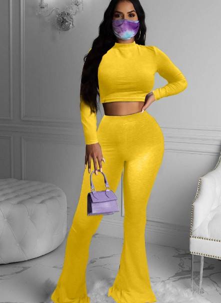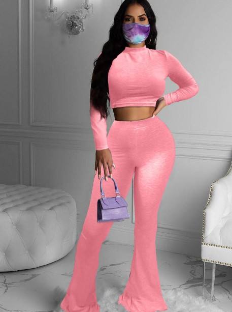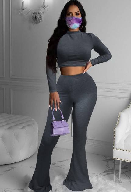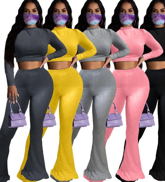 Women's Casual Flared Pants and Long Sleeve Tunic Top Set Solid Color Fashionable Knitting Fabric Popular Style