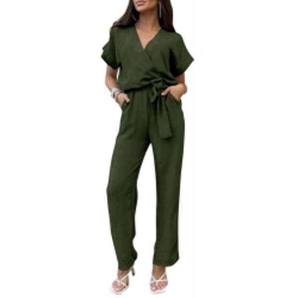 Women's Casual Jumpsuit V Neck Belted Wide Leg Pants Short Sleeve Midi Wrap Fitness Rompers for Clubwear 3XL Pattern Print