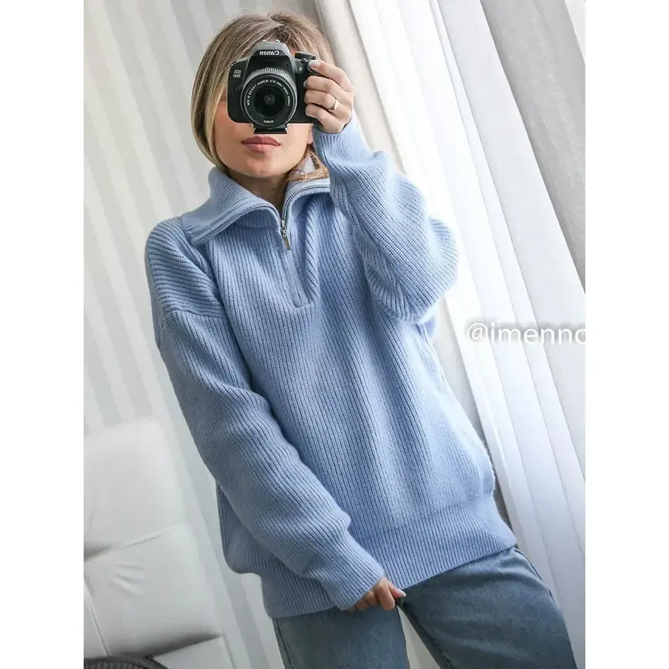Women's 2024 Casual Winter Knitted Pullover Solid Green & Sky Blue Long Sleeve Turtleneck with Zippers Fashionable Sweater