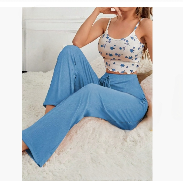 Ensemble de pyjama pour femme, décontracté, en coton mélangé, à motif côtelé, à séchage rapide, taille élastique, sans manches, longueur totale, pour la saison de printemps