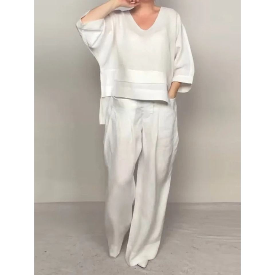Ensemble 2 pièces pour femmes, décontracté, couleur unie, grande taille, manches trois quarts irrégulières, col en V, haut et pantalon en coton, tendance