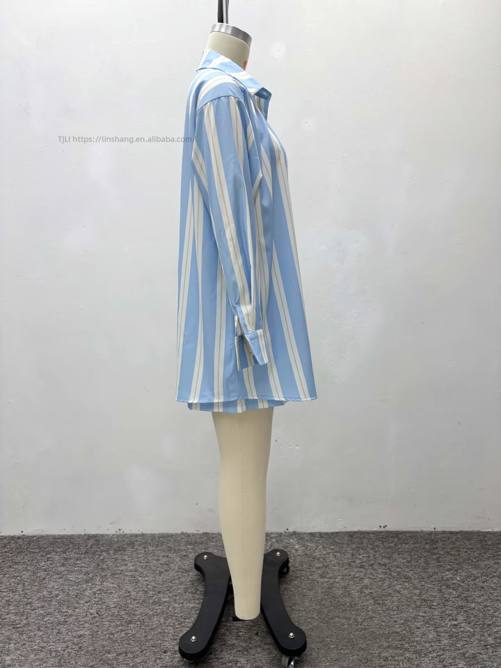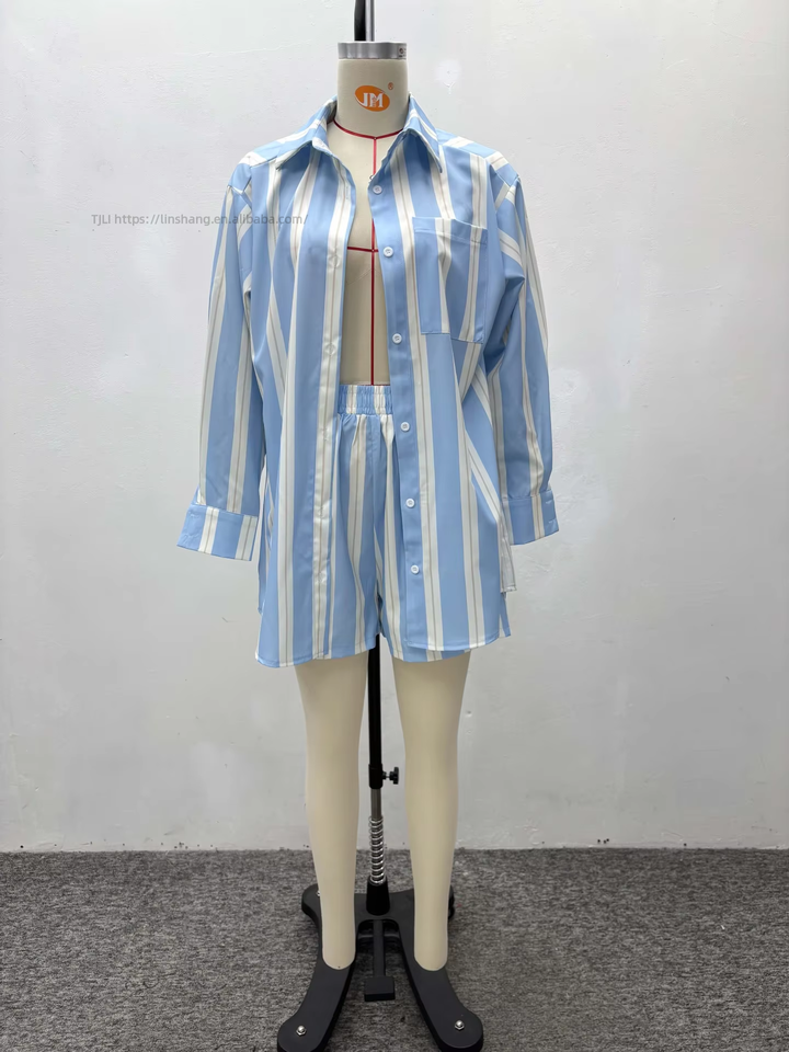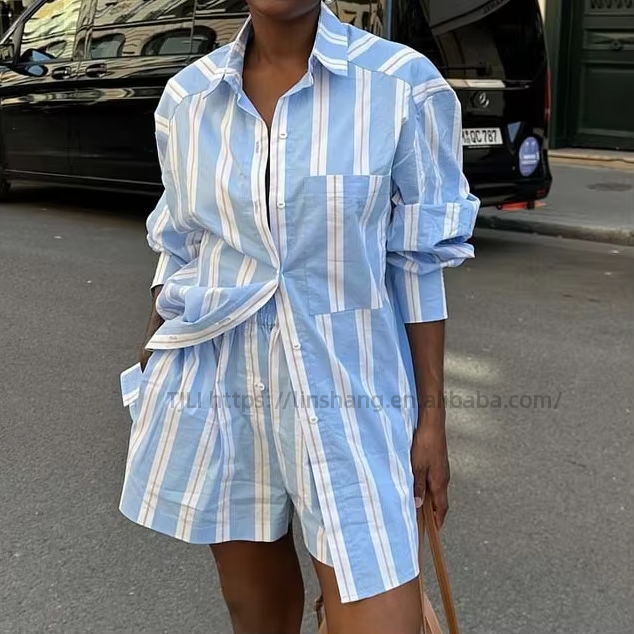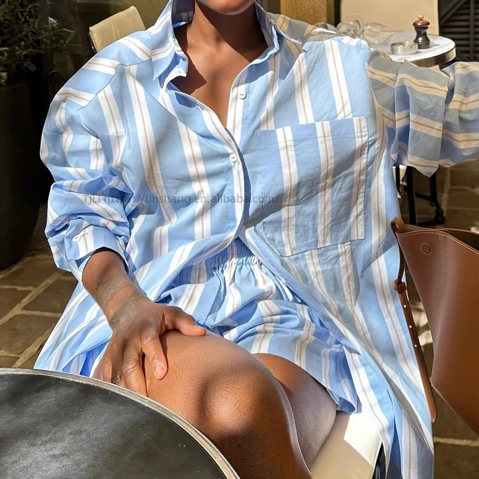 Ensemble 2 pièces tendance pour femme : chemise à col rayée color-block à manches longues et short décontracté polyvalent de style africain