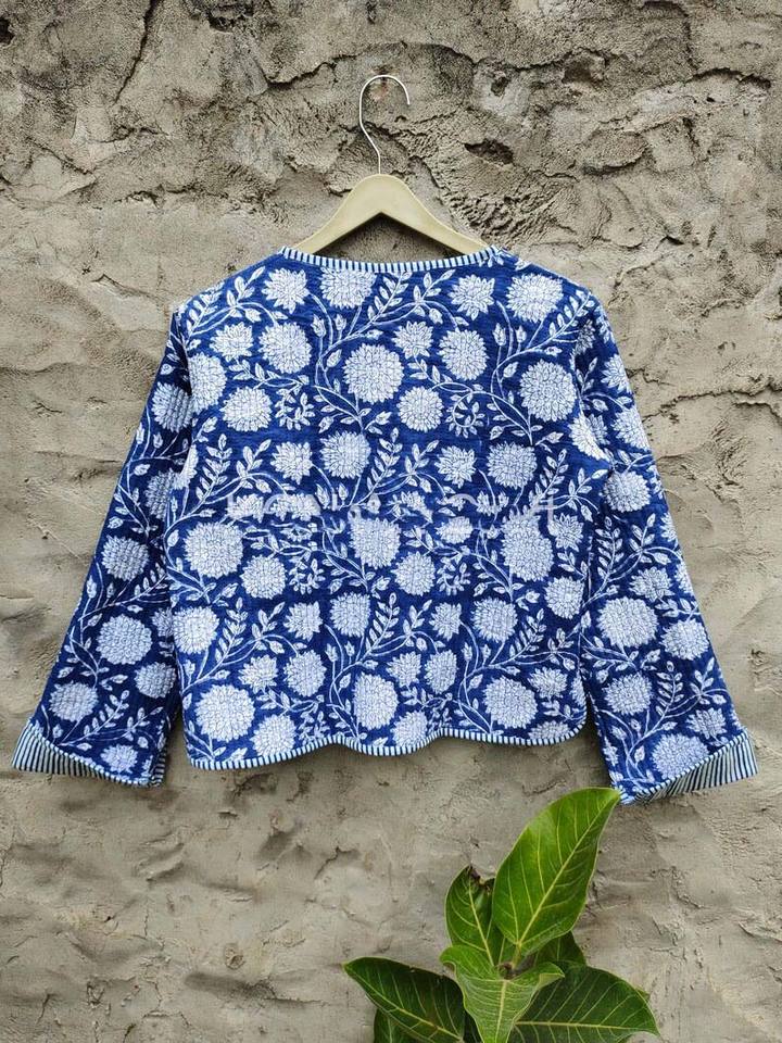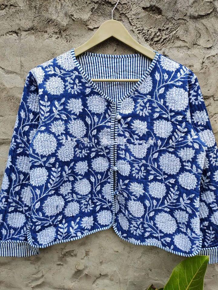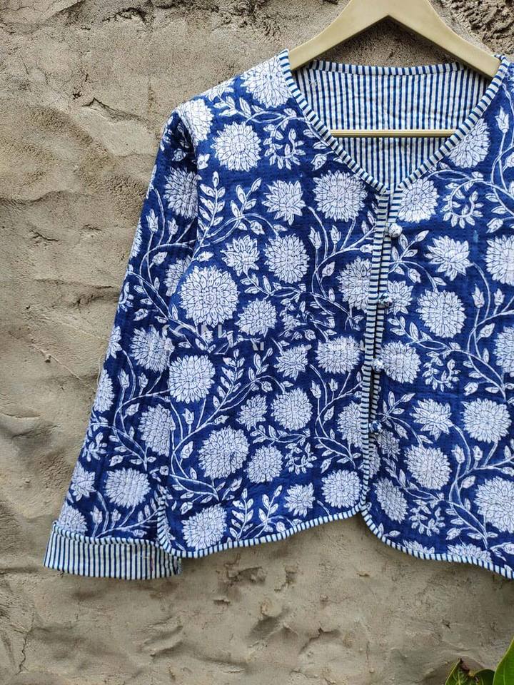 Women's Cotton Quilted Coat Short Kantha Jacket with Hand Block Flower Print Boho Hippie Style Printed Unisex Pocket Decoration