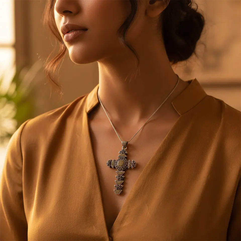 Women's Cross Pendant Necklace 925 Silver 18K Gold Rhodium Geometric Pattern Featuring Zircon Diamond Gemstones Christian Trendy
