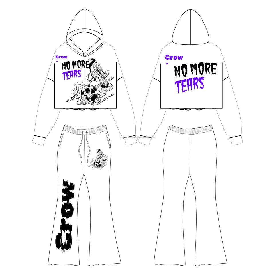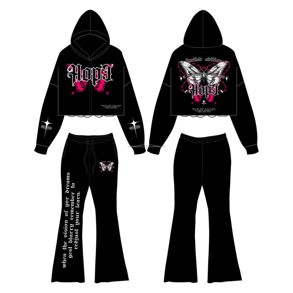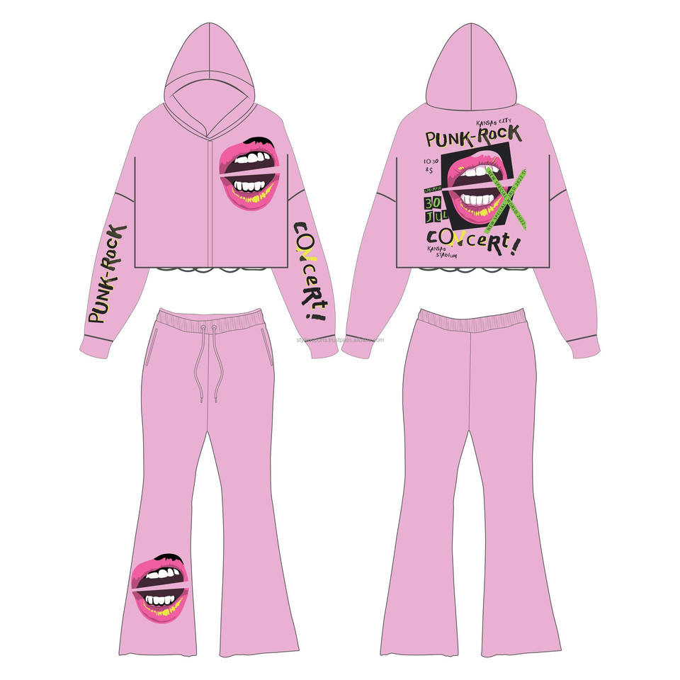 Survêtement évasé empilé patchwork à impression bouffante 3D personnalisé pour femmes ensemble 2 pièces XXL pantalon de survêtement à jambe large à capuche logo d'hiver imprimé