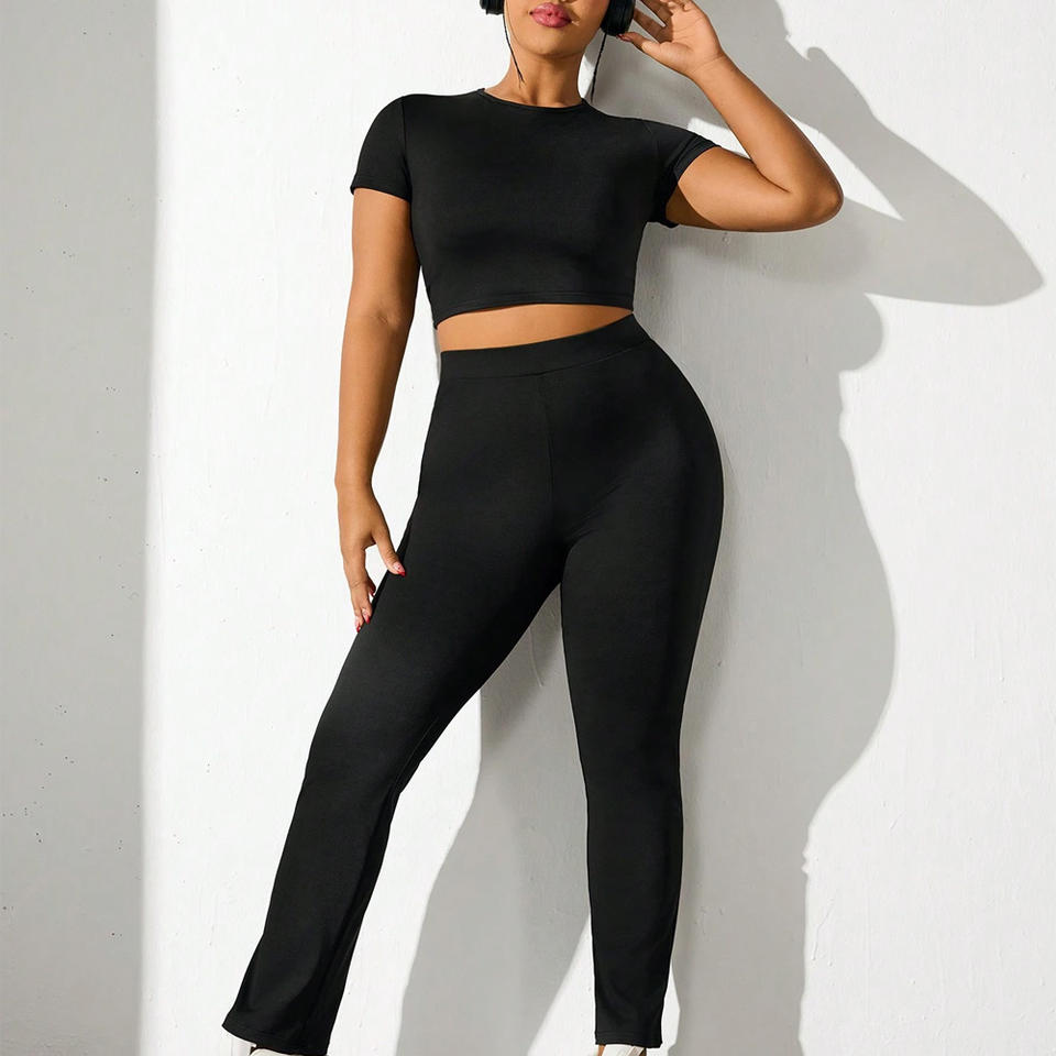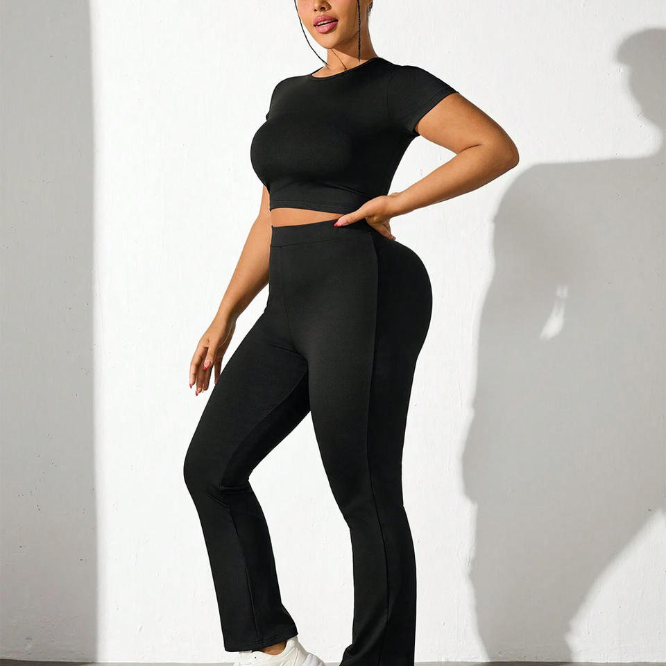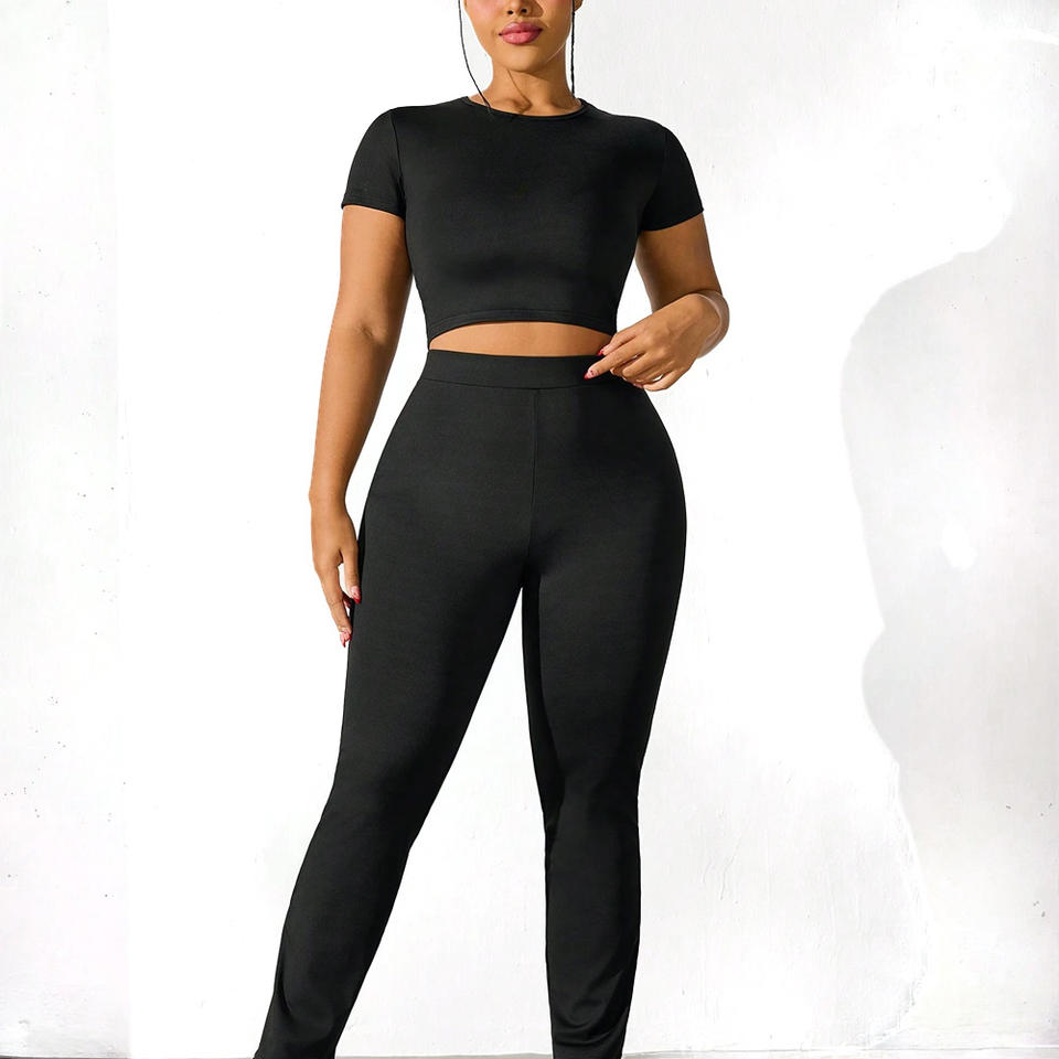 Ensemble de vêtements de sport de gymnastique haute élastique personnalisé pour femmes respirant à manches courtes t-shirt Leggings tissu côtelé solide bouton de dentelle pour la course