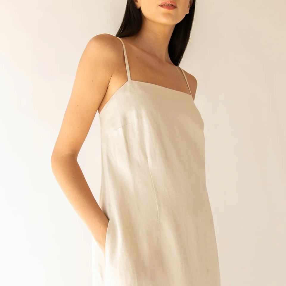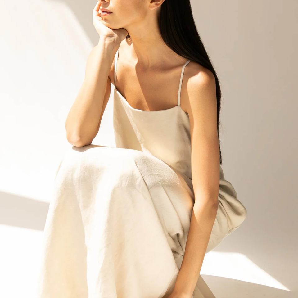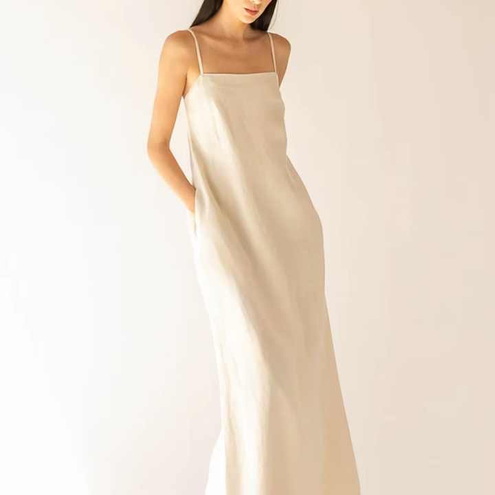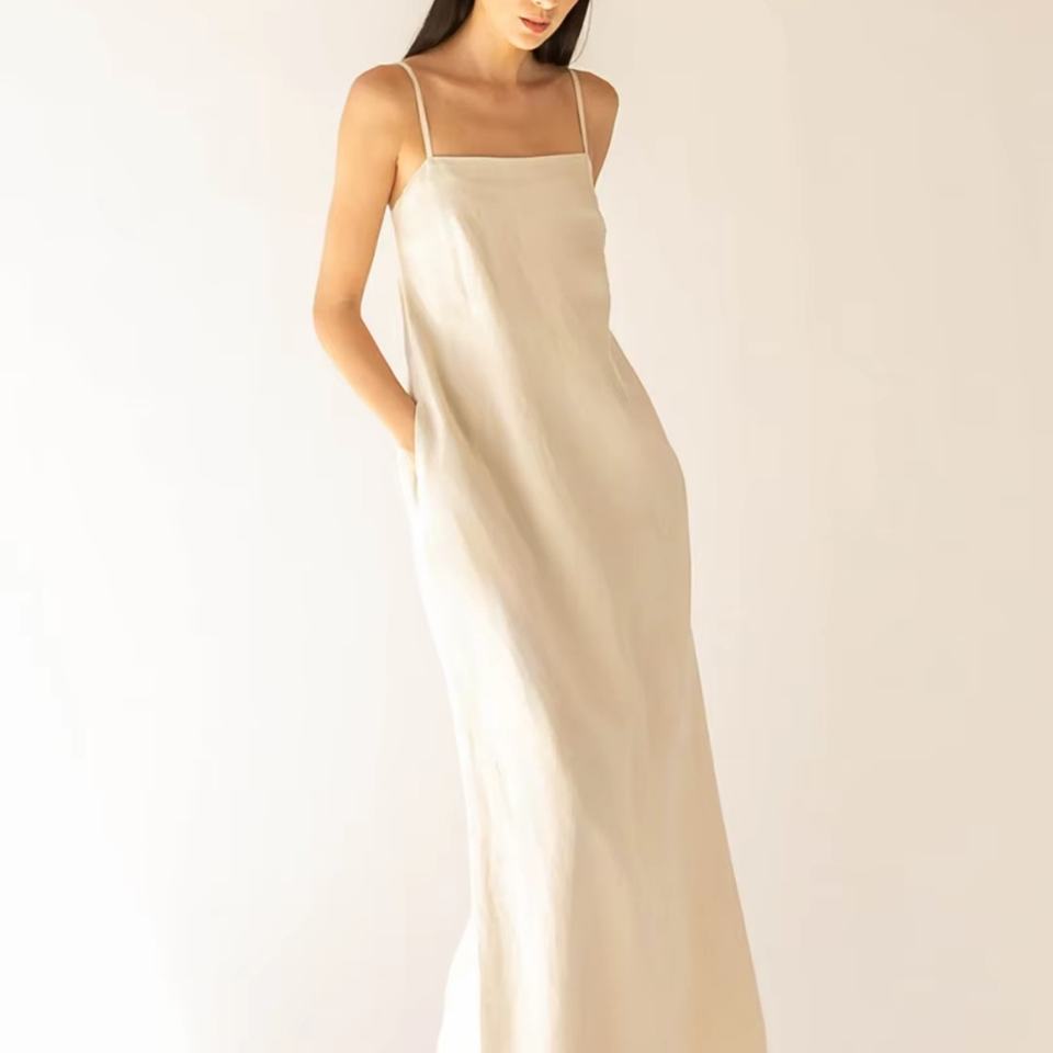Robe longue en lin mélangé personnalisée pour femme, couleur ivoire, bretelles spaghetti, col carré