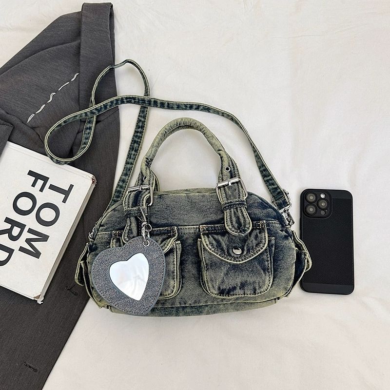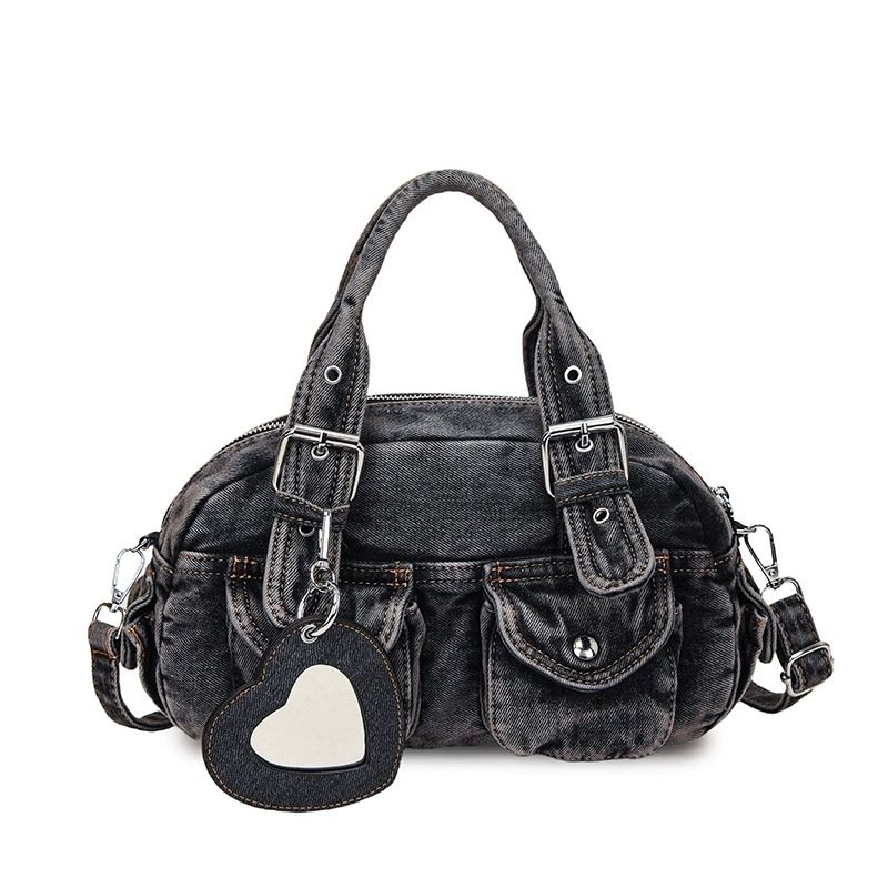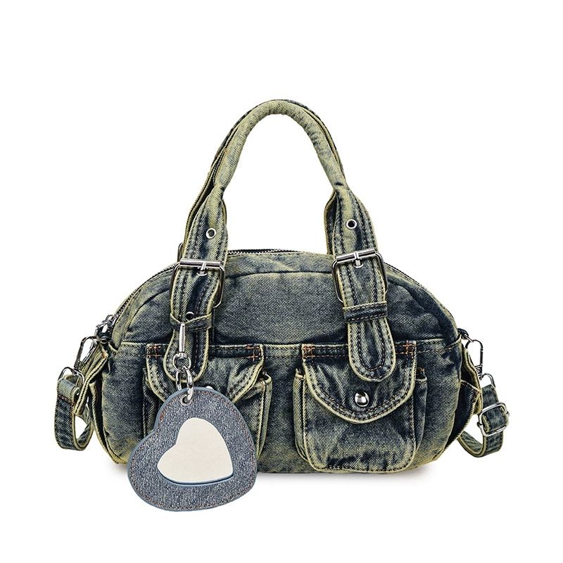 Women's Denim Bag Y2K Vintage Grey Jean Purse and Handbags Crossbody Shoulder Bags Retro Large Capacity Totes With Heart Mirror