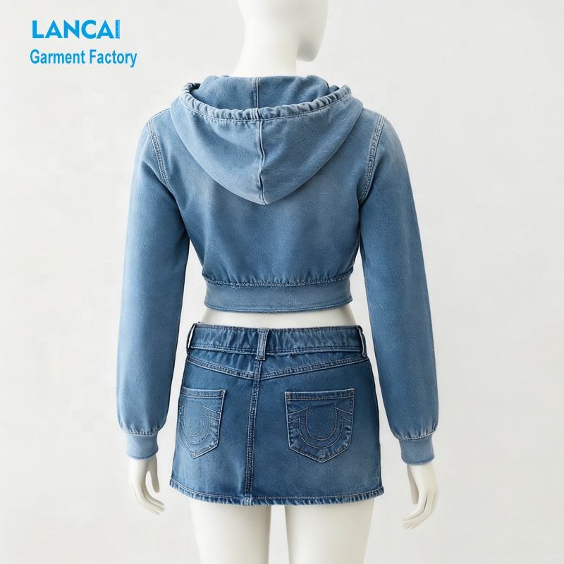 Ensemble deux pièces en jean pour femme, comprenant un hoodie court et une jupe, confectionné sur mesure.