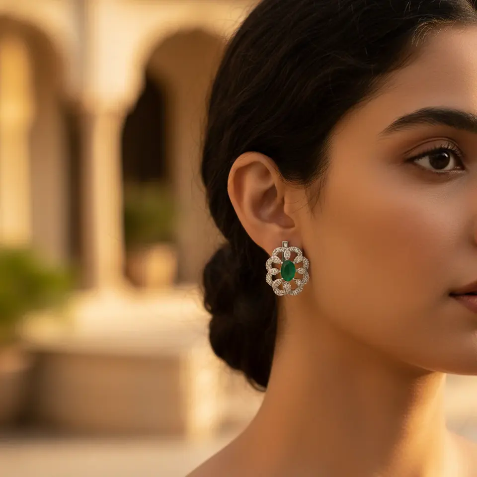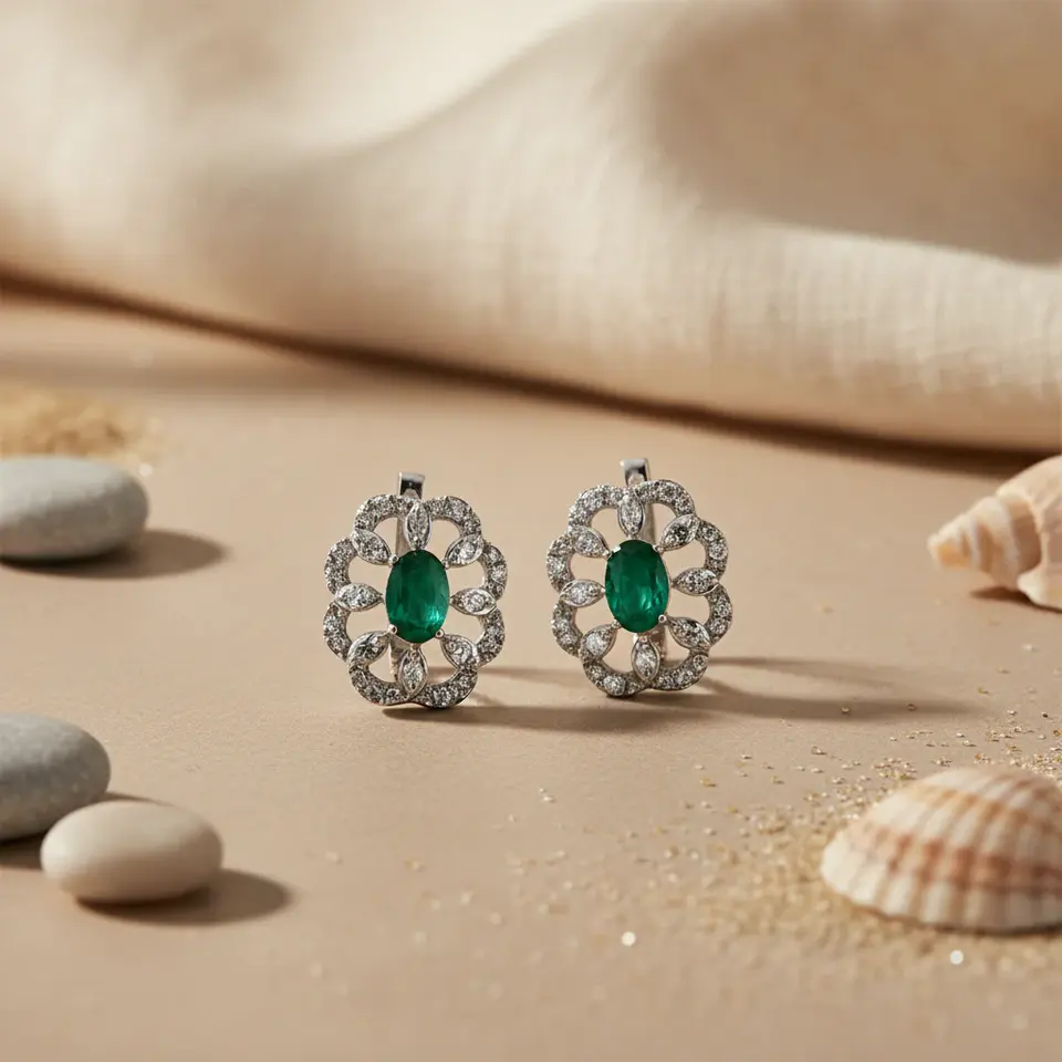 Women's Emerald Stud Earrings Silver Floral Design 18K Yellow Gold 18K Gold Floral Pattern Emerald Cut Ruby Sapphire Pearl